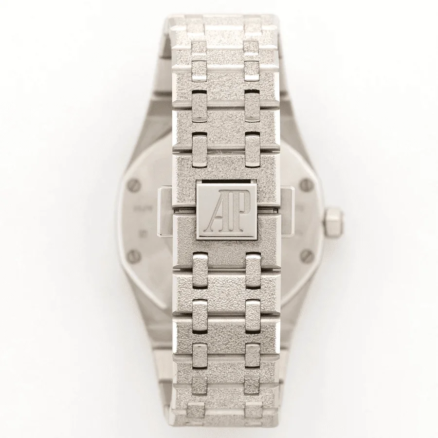 The Royal Oak Frosted Replica from Audemars Piguet is a striking watch. It features a 904L stainless steel case and bezel, both in white gold and gem-set. The crystal is sapphire and the size is 33.00mm. The Royal Oak bracelet is also 904L stainless steel, adjustable for all sizes, and features a folding clasp in white gold. The dial is gem-set and features stick and dot indices, with stick hands in 904L stainless steel.