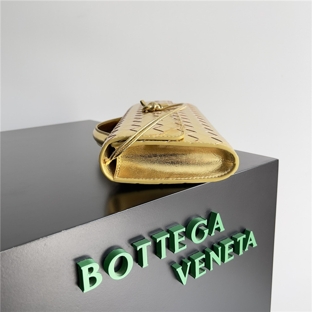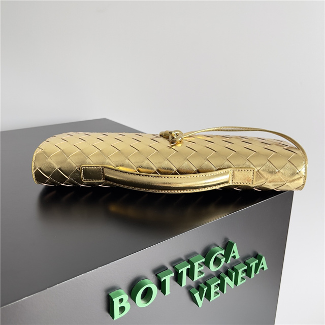 Top handle clutch in Intrecciato leather with foggy mirror effect and signature knot closure.