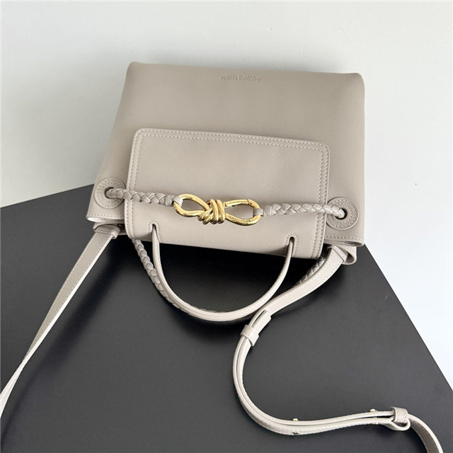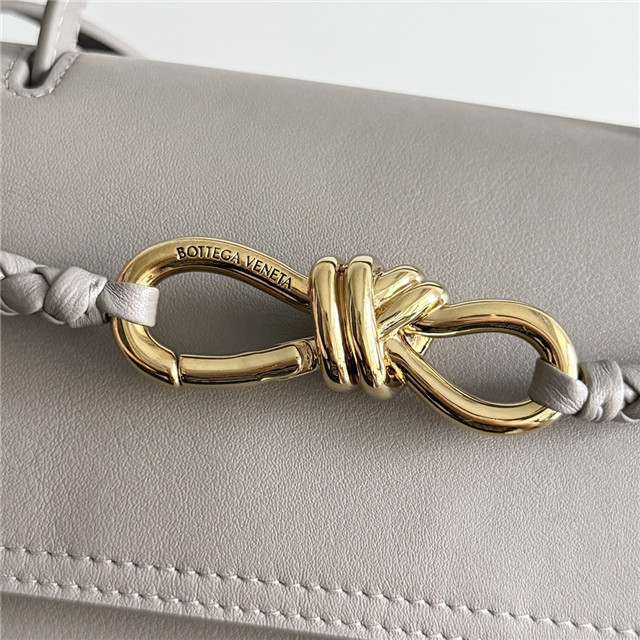 Top handle bag in silky calf leather with two-way flap and signature knot detail. Features a hidden hook closure, allowing the flap to be closed in the front or attached to the interior Intrecciato pocket.