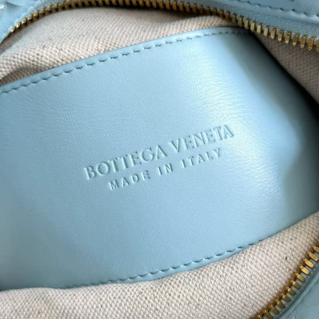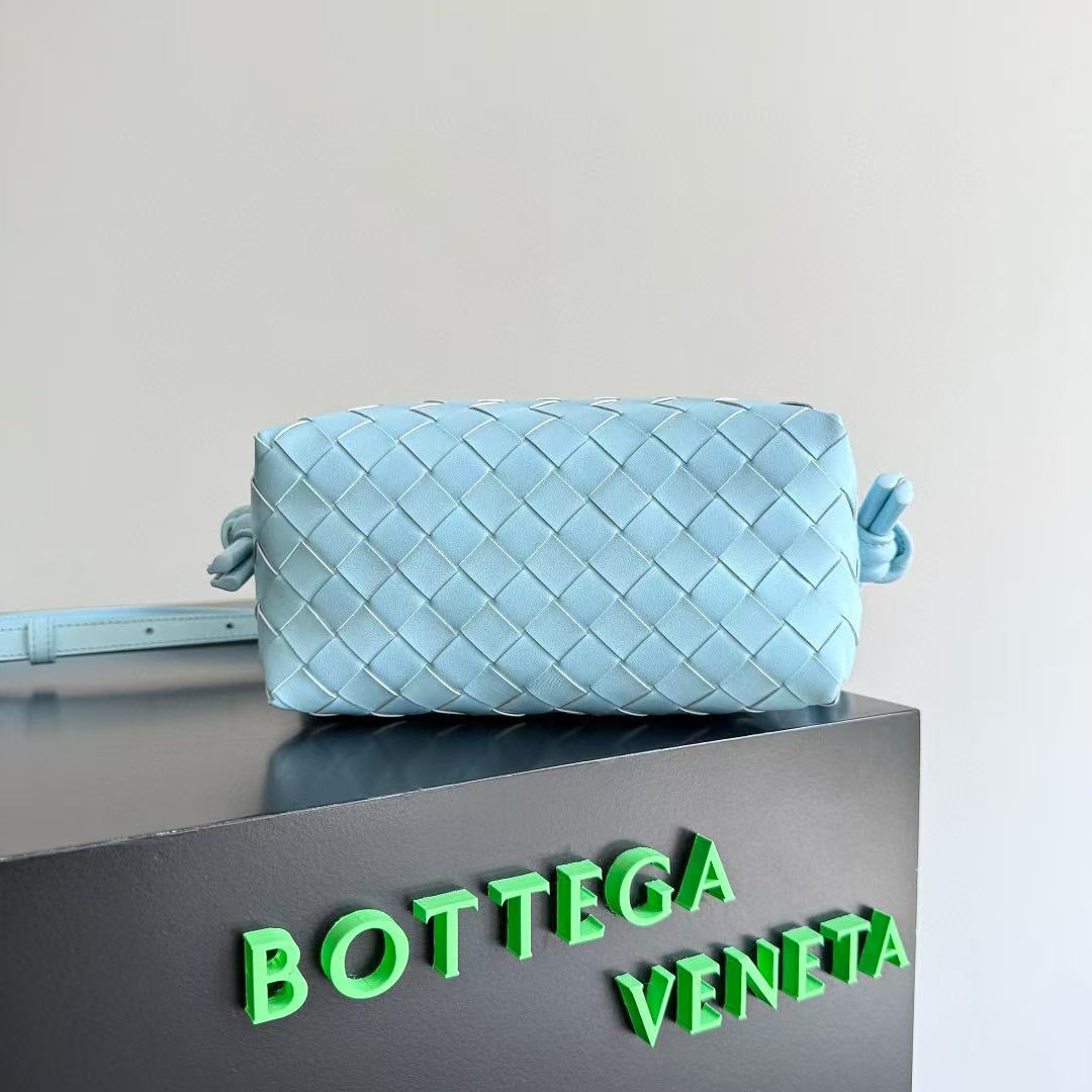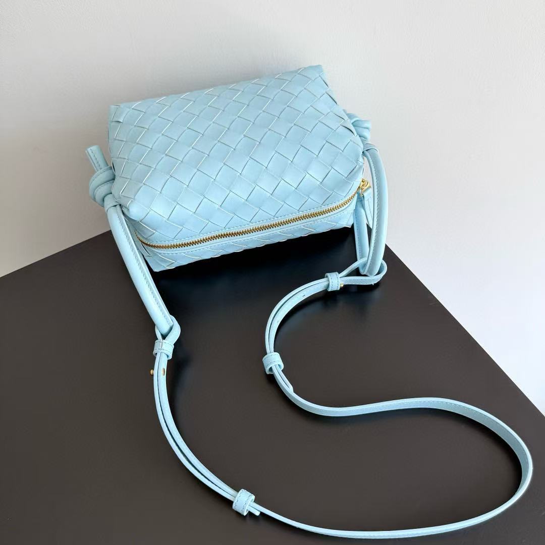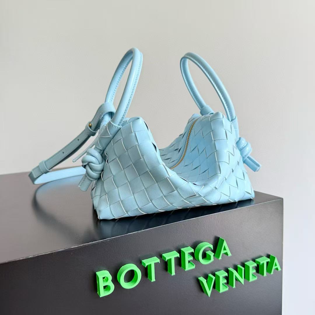 Intrecciato leather cross-body bag with double handles and detachable strap.