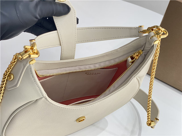 The new SERPENTI ELLIPSE Collection Medium shoulder Bag adds a stylish touch to the world of SERPENTI FOREVER with unique styling, signature details and ever-changing charms. Crafted from Niagara sapphire White calfskin, this everyday bag is an urban grain calfskin with smooth textured calfskin on both sides and a gilt brass accessory with a charming classic snake head with black onyx scales in the center and red enamel eyes hidden by magnetic buttons on the front. With a single compartment, adjustable chain and leather shoulder strap, and removable leather handle, it can be worn across the body or as a classic shoulder bag. Practical top zipper with three internal pockets, back with an external pocket and BVLGARI metal logo.