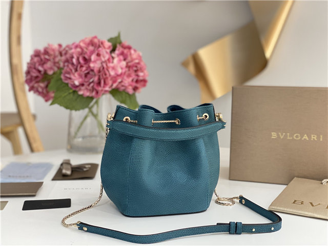 SERPENTI FOREVER Series of small Bucket bags are handmade with green metallic water snakeskin, a combination of precious materials, timeless design and exquisite craftsmanship. A practical drawstring closure, embellished with a snake element chain, and adorned with a classic snake head buckle, its seductive scales and design draw inspiration from the SERPENTI jewelry collection of the 1960s. Equipped with leather handles and serpentine chains and leather straps, a single compartment, a card pocket and an inboard metal nameplate engraved with BULGARI”s logo