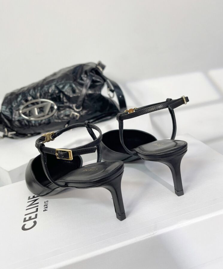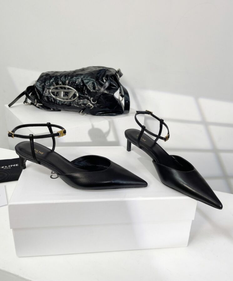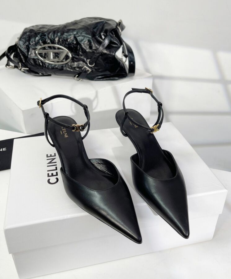 100% Calfskin 100% Goatskin Lining 2 In (50 Mm) Heel Straight Kitten Heel Pointy Toe Shape Metal Triomphe Signature On The Front Of The Ankle Strap Celine Engraved Adjustable Buckle Leather Insole Leather Outsole