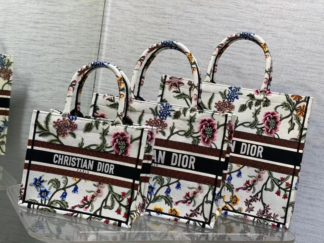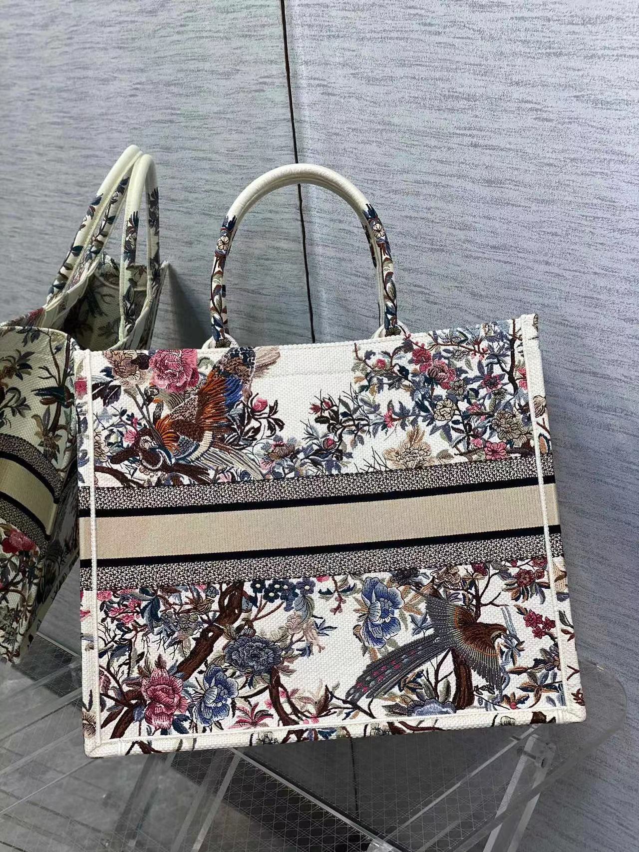 Introduced by Maria Grazia Chiuri, Dior’s Creative Director, the Dior Book Tote has become a staple of the Dior aesthetic. Designed to hold all the daily essentials, the style is fully embroidered with an ecru multicolor Dior Jardin d’Hiver motif, showcasing a poetic and exotic interpretation of Mr. Dior’s wall tapestries. Adorned with the ‘CHRISTIAN DIOR PARIS’ signature on the front, the small tote exemplifies the House’s signature savoir-faire and may be carried by hand or worn over the shoulder.