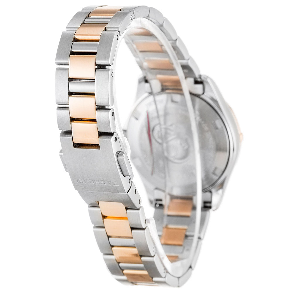 The bold and beautiful blends high performance with optimal readability and prestige styling. The 27mm case is crafted from a solid block of Stainless steel case with a stainless steel bracelet with 18kt rose gold links. Fixed 18kt rose gold bezel. Mother of pearl dial with luminous rose gold hands and diamond hour markers. The 3 o’clock position. Quartz movement. Scratch resistant sapphire crystal. The beautiful two-tone stainless steel link bracelet,securely fastened with a secure folding clasp.