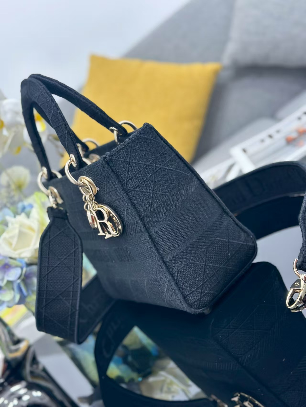 The Lady D-Lite bag combines classic elegance with House modernity. The style is fully embroidered with the season’s signature black and white Plan de Paris motif, inspired by House archives and centered around Dior’s historic address on Avenue Montaigne. The front features a Christian Dior Paris signature while the D.I.O.R. charms in pale gold-finish metal embellish and illuminate the silhouette. Equipped with a wide, reversible and removable embroidered shoulder strap, the medium Lady D-Lite bag can be carried by hand or worn crossbody.