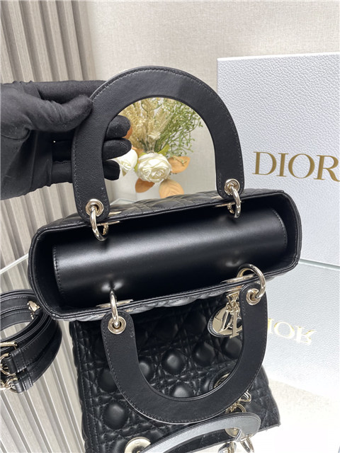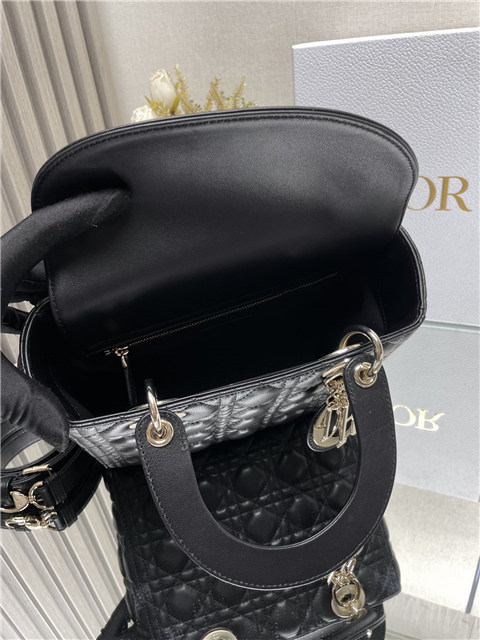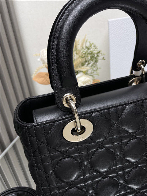 The Lady Dior bag epitomizes the House””s vision of elegance and beauty. Sleek and refined, the timeless creation is crafted in black lambskin with Cannage stitching, creating the instantly recognizable quilted texture. The pale gold-finish metal D.I.O.R. charms offer elegant appeal. Featuring a thin, removable leather shoulder strap, the medium Lady Dior bag can be carried by hand or worn crossbody.