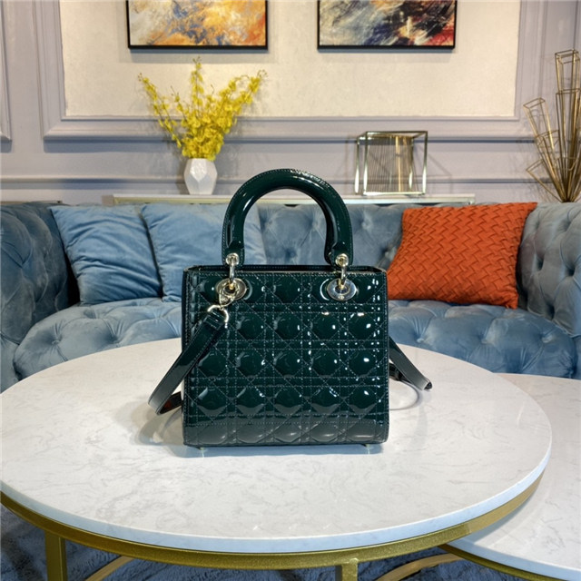 The Lady Dior bag embodies the House””s vision of elegance and beauty. Sleek and refined, the style is timeless. Crafted in Green patent calfskin with Cannage stitching, its quilted texture is immediately recognizable. Pale gold-finish metal D.I.O.R. charms complete and illuminate its silhouette. Featuring a thin, removable leather shoulder strap, the medium Lady Dior bag can be carried by hand or worn crossbody.