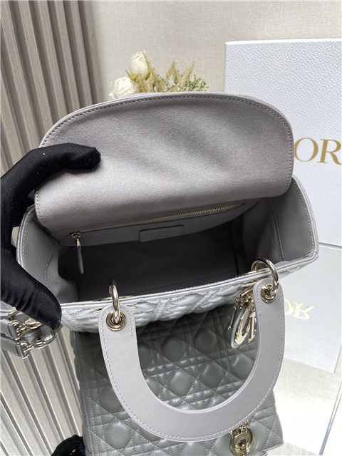 The Lady Dior bag epitomizes the House””s vision of elegance and beauty. Sleek and refined, the timeless creation is crafted in melocoton Grey pearlescent lambskin with Cannage stitching, creating the instantly recognizable quilted texture. The pale gold-finish metal D.I.O.R. charms offer elegant appeal. Featuring a thin, removable leather shoulder strap, the medium Lady Dior bag can be carried by hand or worn crossbody.