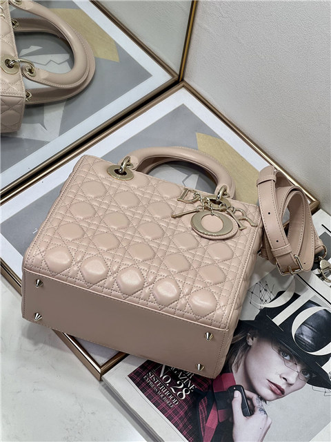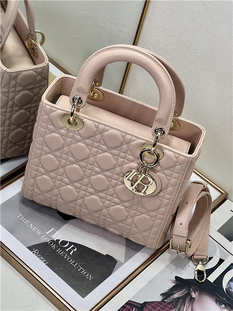 The Lady Dior bag epitomizes the House””s vision of elegance and beauty. Sleek and refined, the timeless creation is crafted in Pink lambskin with Cannage stitching, creating the instantly recognizable quilted texture. The pale gold-finish metal D.I.O.R. charms offer elegant appeal. Featuring a thin, removable leather shoulder strap, the medium Lady Dior bag can be carried by hand or worn crossbody.