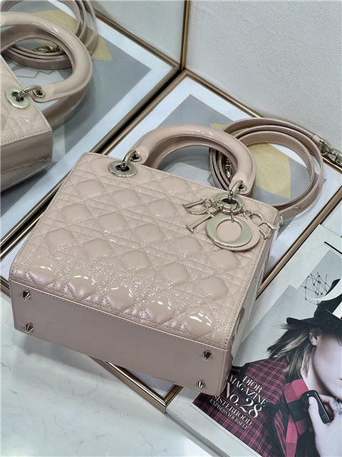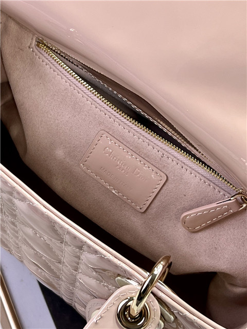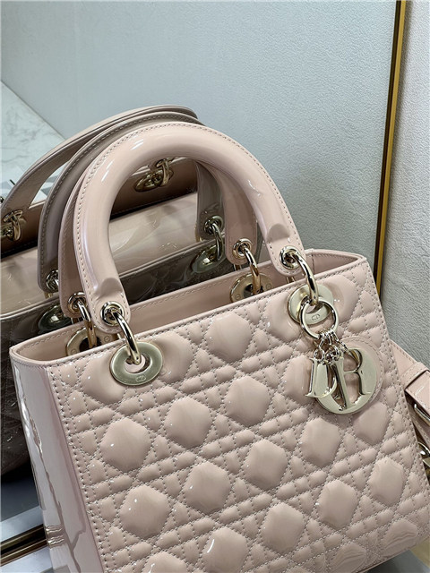 The Lady Dior bag embodies the House””s vision of elegance and beauty. Sleek and refined, the style is timeless. Crafted in Pink patent calfskin with Cannage stitching, its quilted texture is immediately recognizable. Pale gold-finish metal D.I.O.R. charms complete and illuminate its silhouette. Featuring a thin, removable leather shoulder strap, the medium Lady Dior bag can be carried by hand or worn crossbody.
