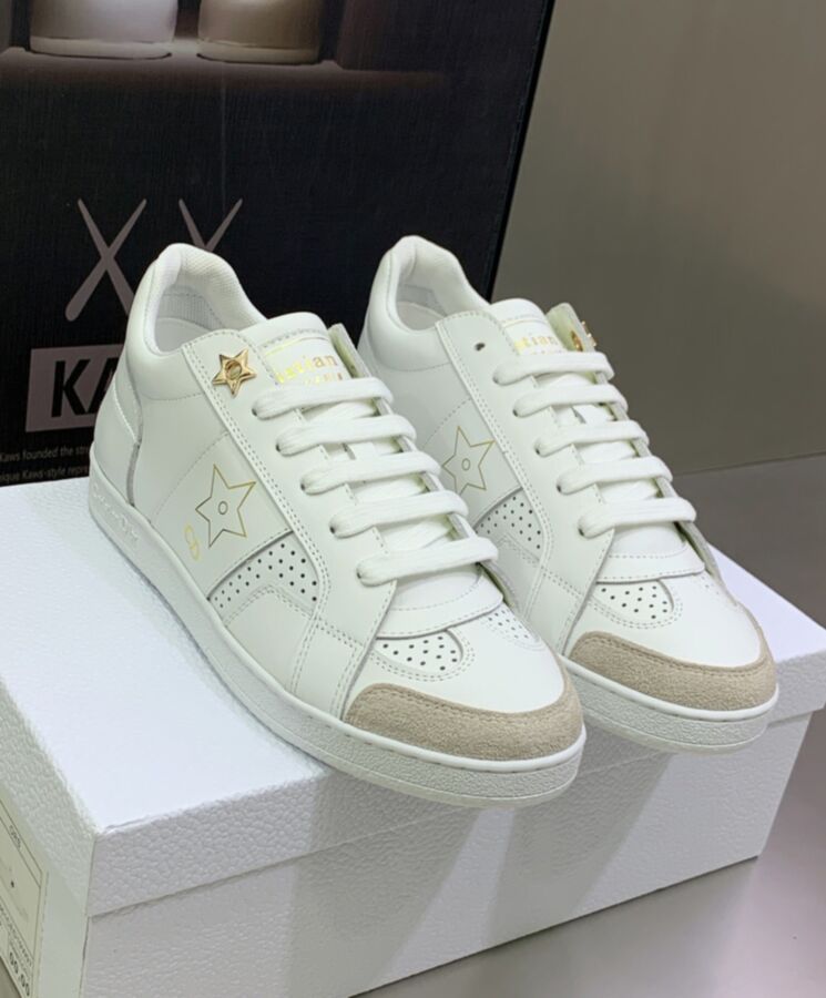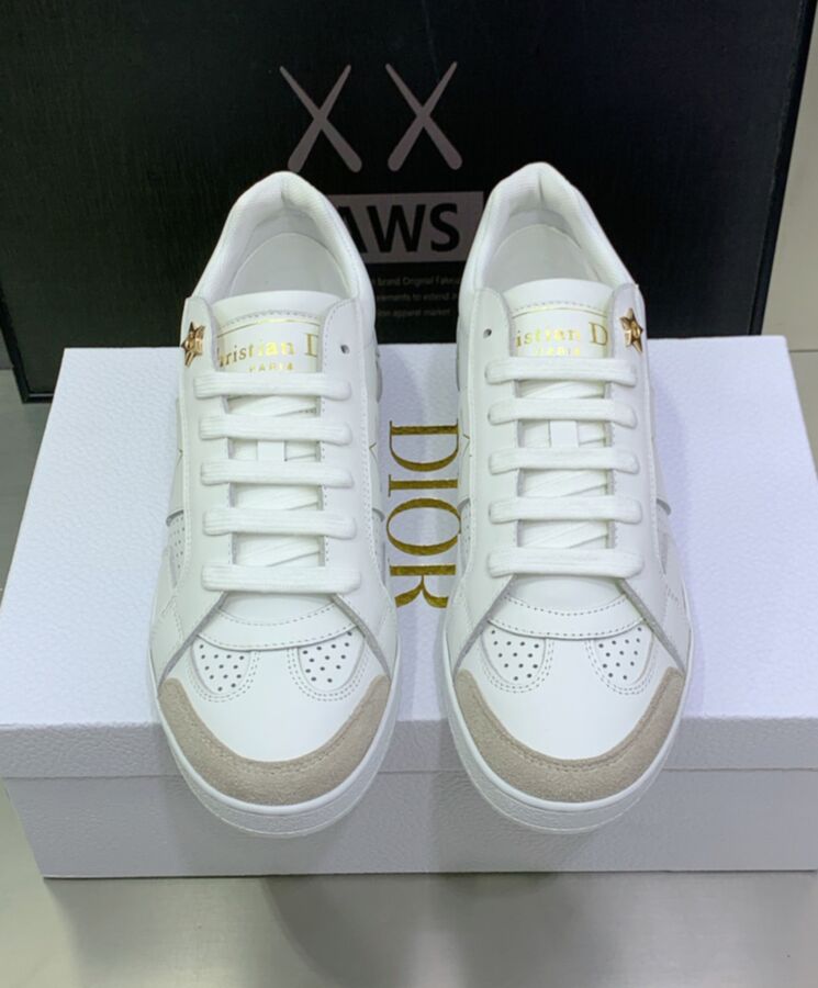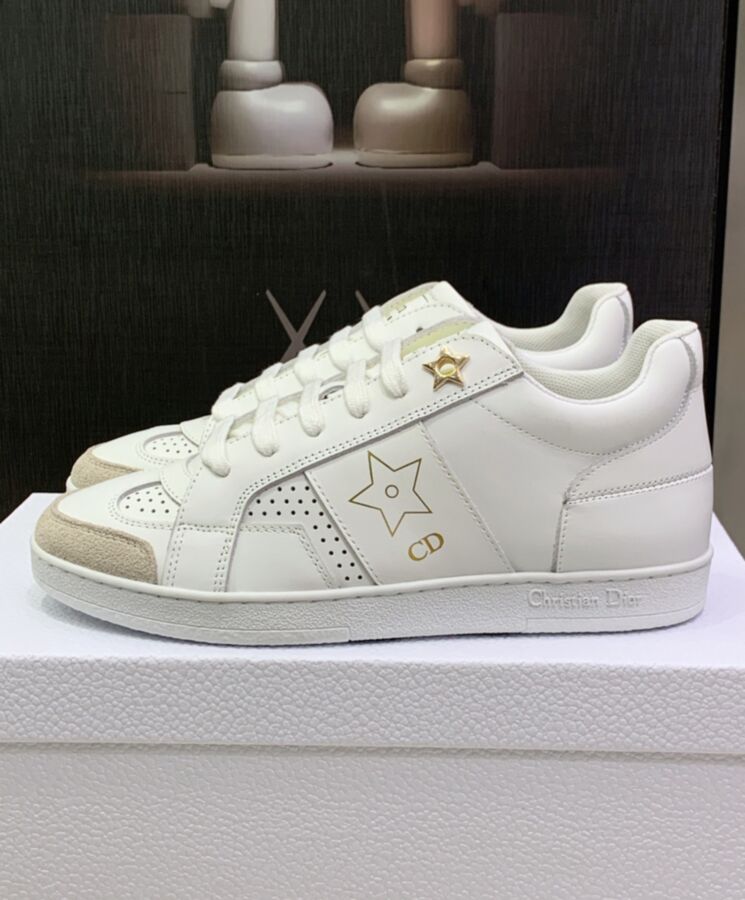 A new essential, the Dior Star sneaker is distinguished by its timeless lines. Crafted in white calfskin, it is embellished with a tonal suede insert on the front. Gold-tone ‘CD’ and ‘Dior PARIS’ signatures adorn the style, while a gold-finish metal star enhances a lacing eyelet. Completed by a thin signature sole, the lightweight sneaker will give the finishing touch to any relaxed outfit, any time of year.
