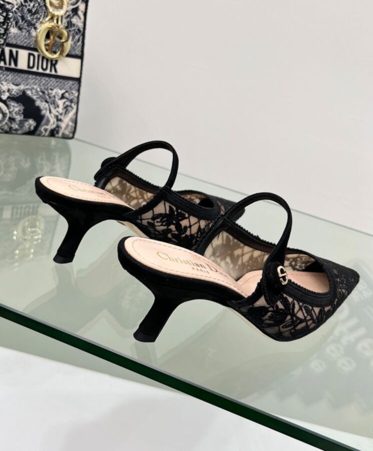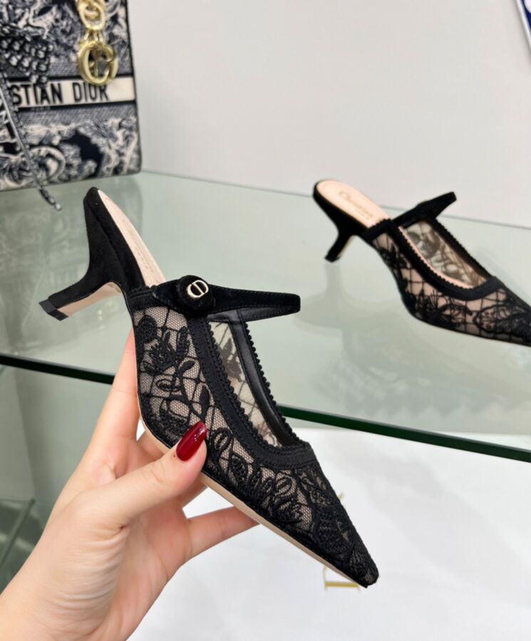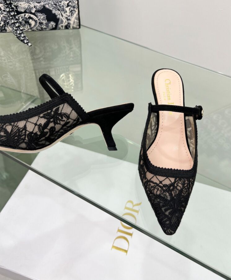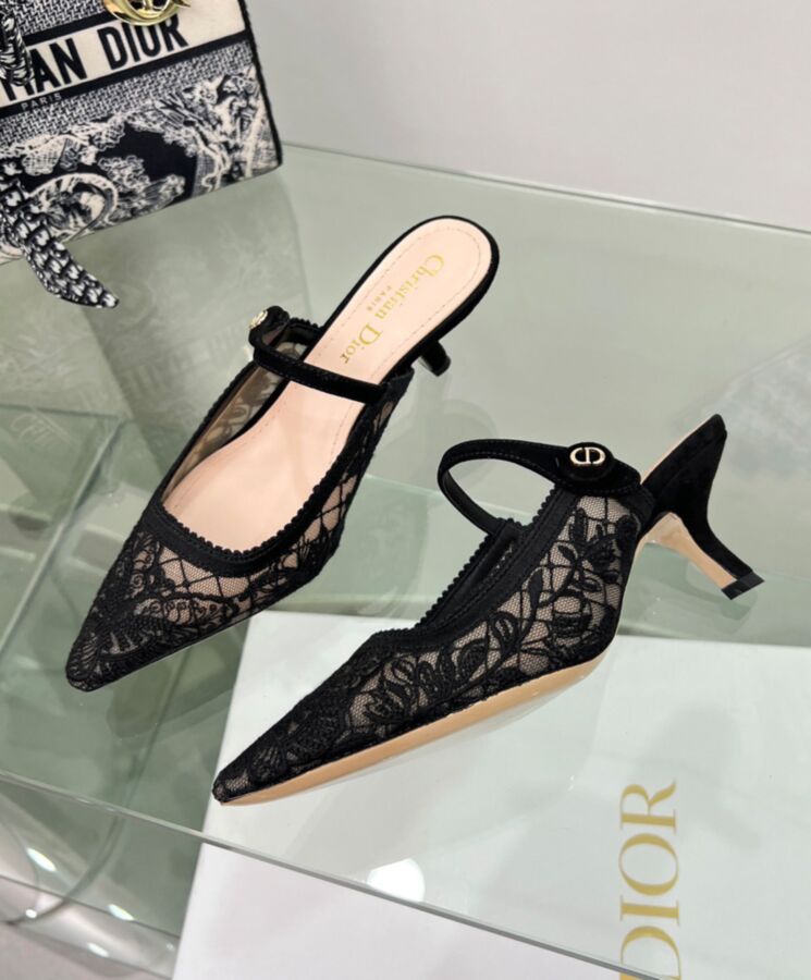 The Dior Capture mule is a delicate creation with the collection’s signature Andalusian baroque inspiration. Offering a sophisticated play on transparency, the mesh style is fully embroidered with the Dior Roses motif embellished with suede details. A strap with a gold-tone ‘CD’ signature and 6.5 cm (2.5) comma heel add the finishing touch to the refined shoe.
