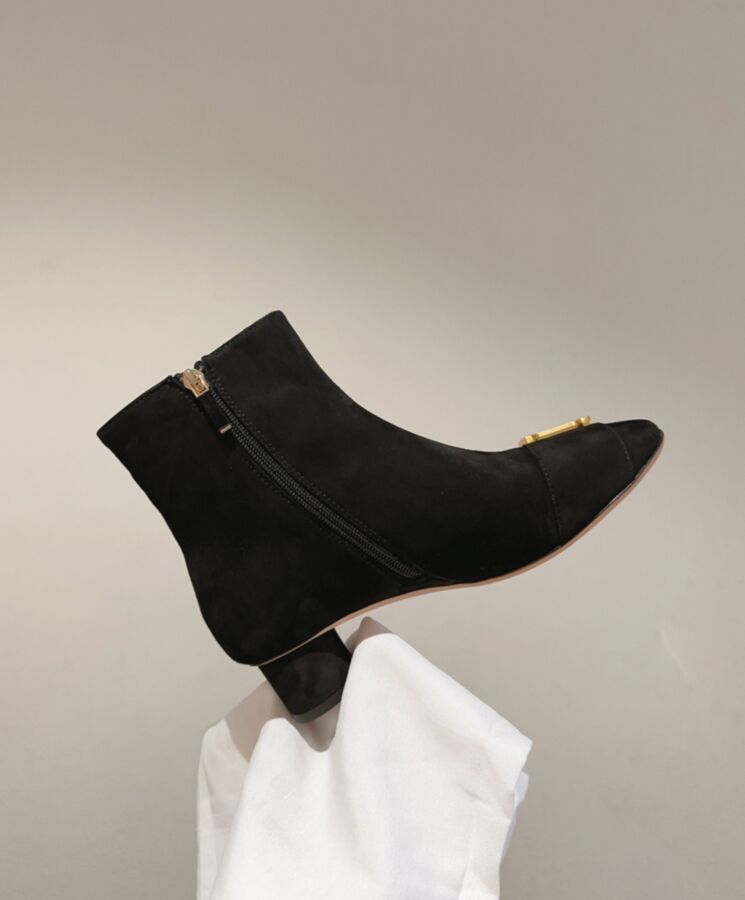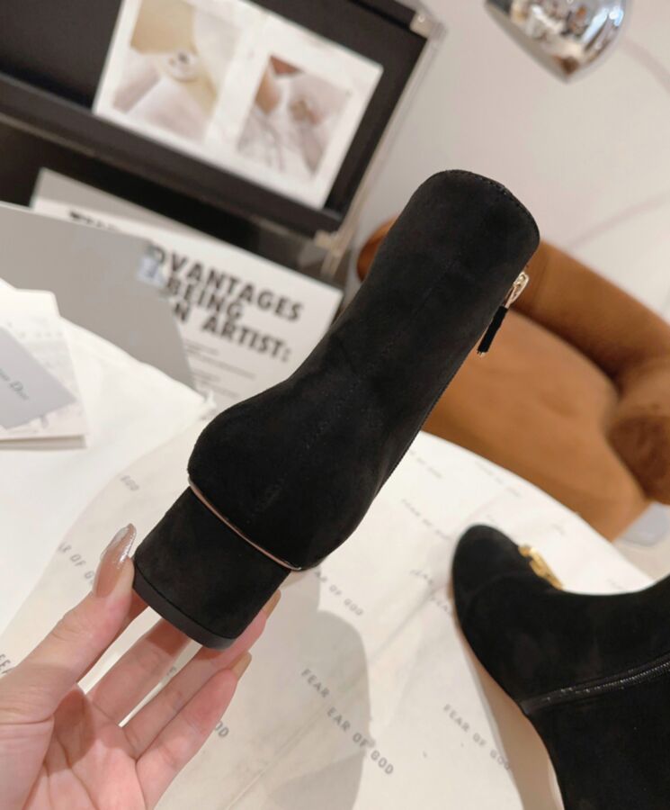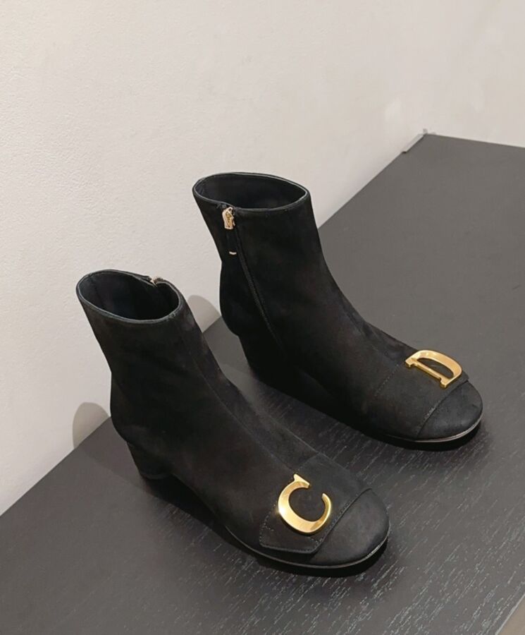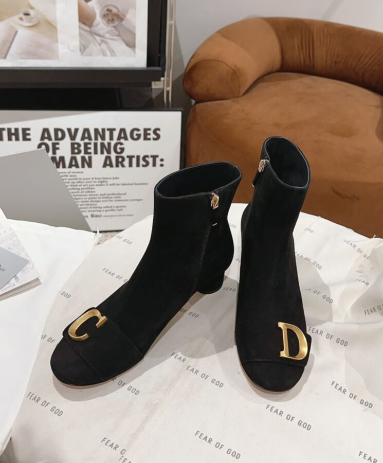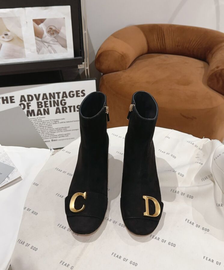 New for Winter 2023, the Cest Dior heeled ankle boot is an elegant and modern creation. Crafted in black suede calfskin, the streamlined style is enhanced by gold-finish metal C and D letters, inspired by House archives. Completed by a rounded toe with a modern look and a 5 cm (2) cylindrical heel, the shoe will lend a refined touch to any outfit.