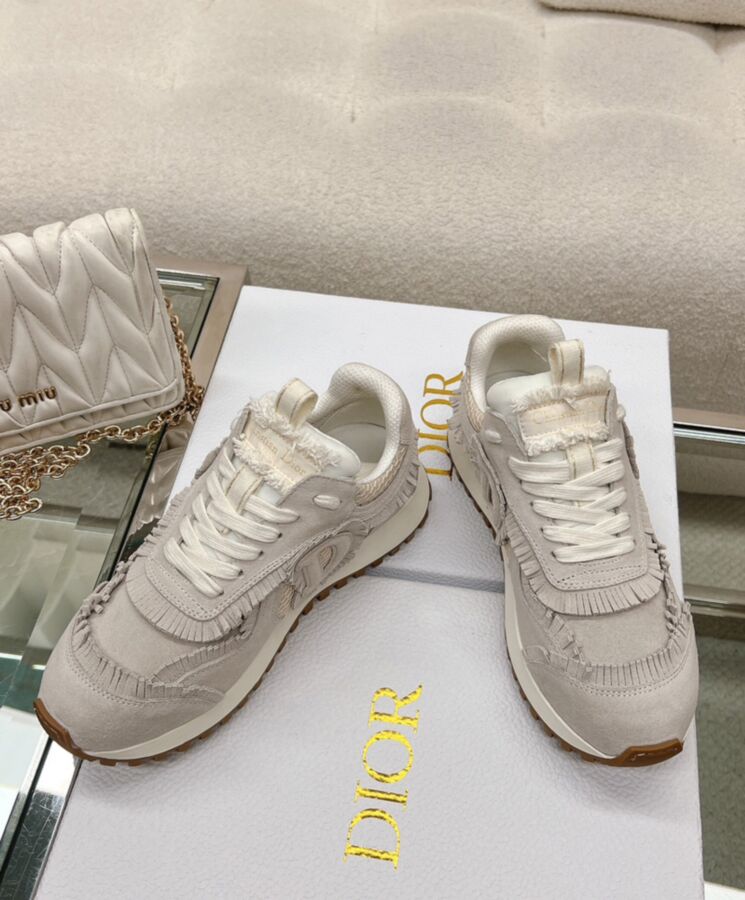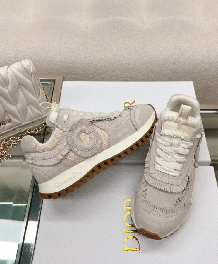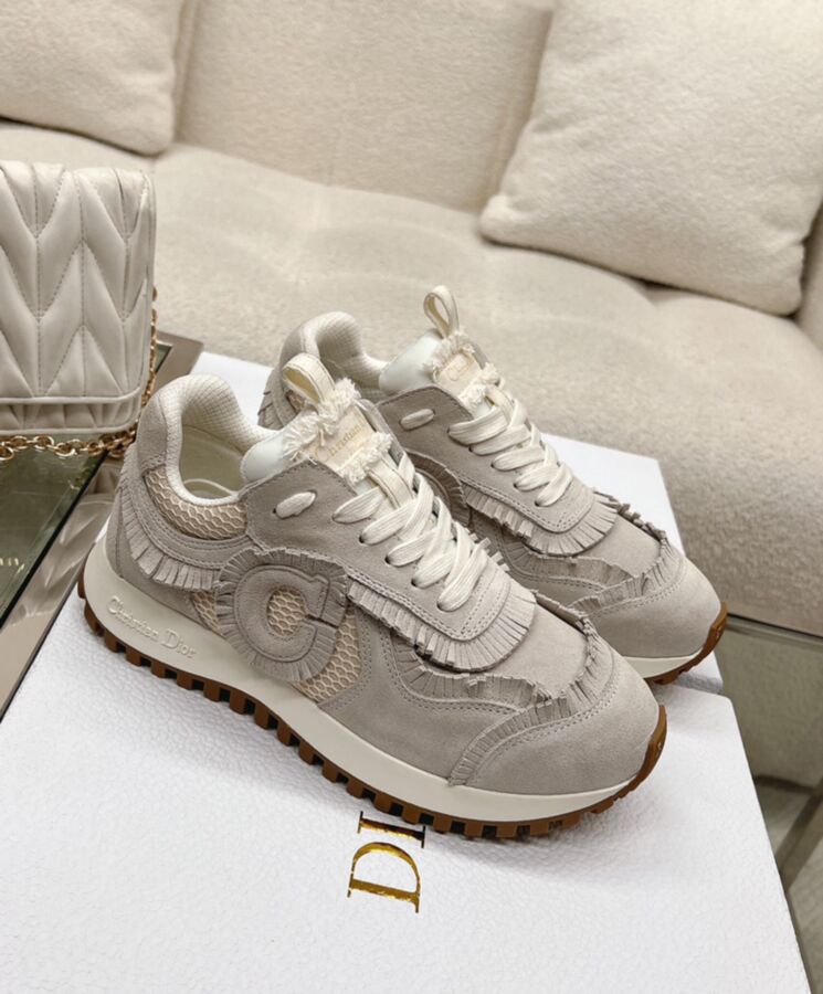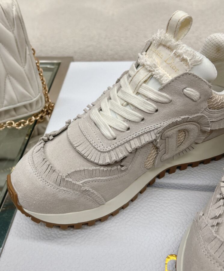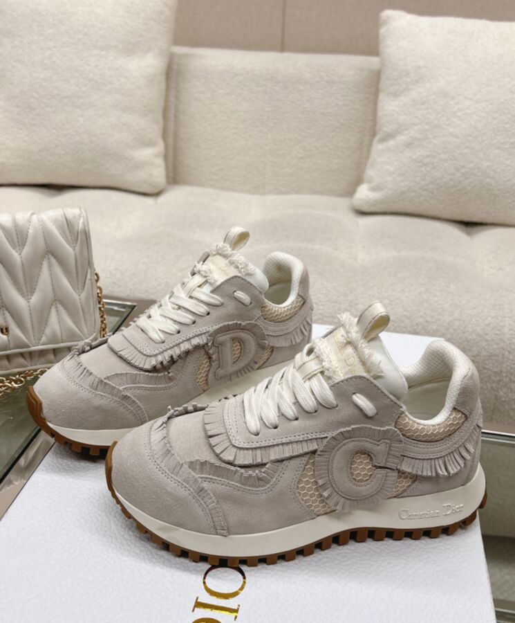 New for the Cruise 2024 collection, the C’est Dior sneaker is a bold, modern creation. The pairing of suede calfskin and mesh is enhanced by the letters C and D on each side of the upper, while fringed details add a touch of elegance. The ultra-lightweight, two-tone Dior sole accentuates the sportswear appeal while offering maximum comfort. The sneaker will add a modern touch to all laid-back looks.