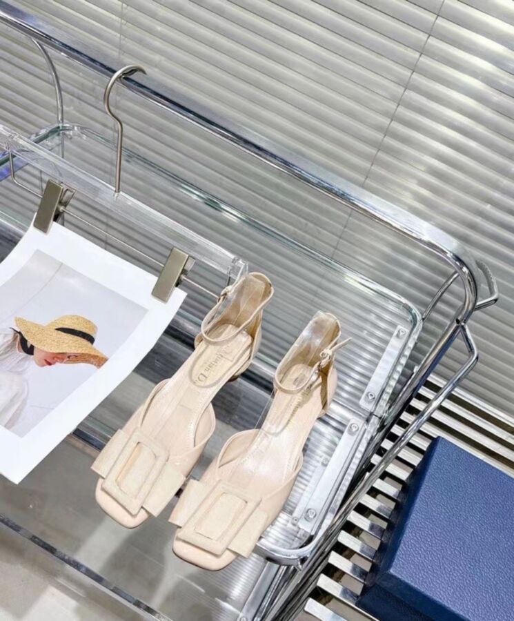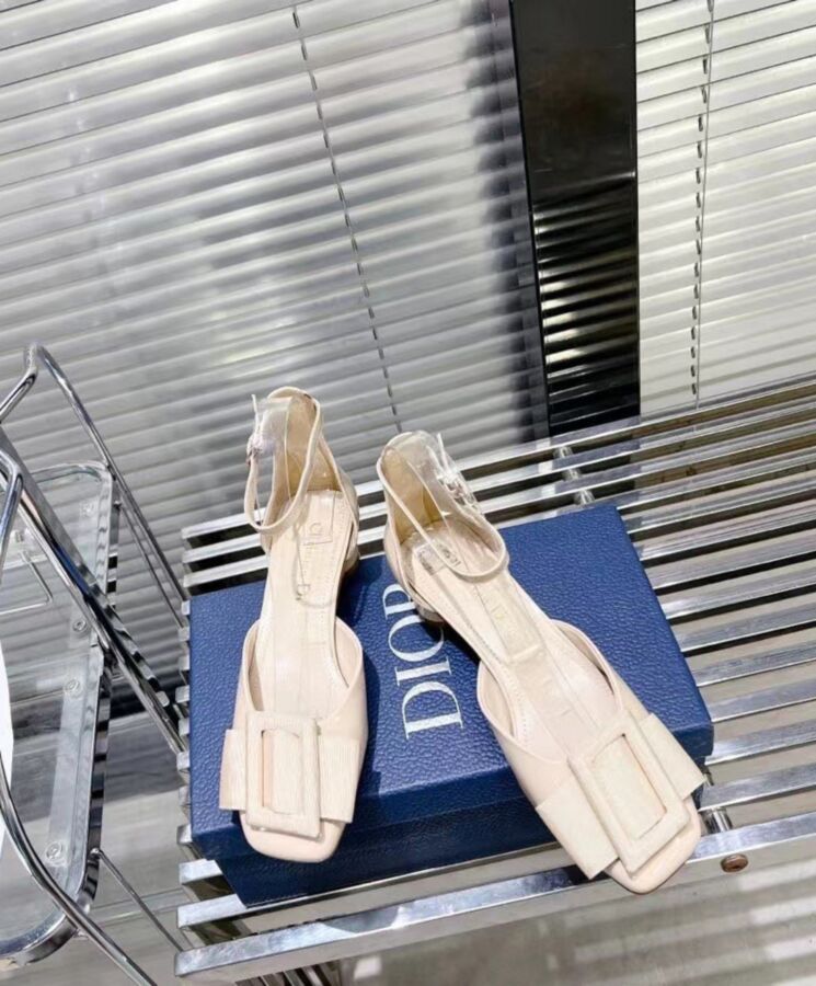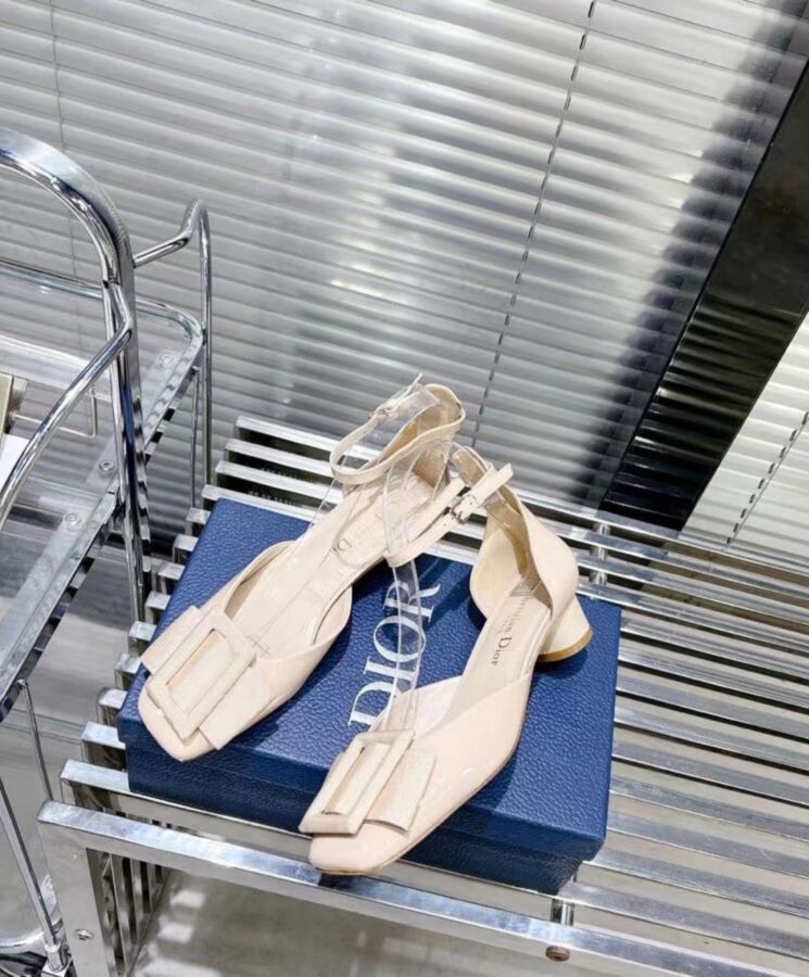 As seen at the fashion show, the Dior Idylle ballet pump is an elegant and modern creation. The patent calfskin upper features a tonal grosgrain bow and asymmetric buckle. It is embellished with iconic House details such as the embossed ‘Dior PARIS’ signature on the heel. The strap subtly highlights the ankle and a 3.5 cm (1.5″) cylindrical heel completes the shoe, which can be paired with the collection’s gaiters for an allure inspired by equestrian elegance.