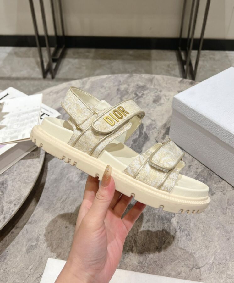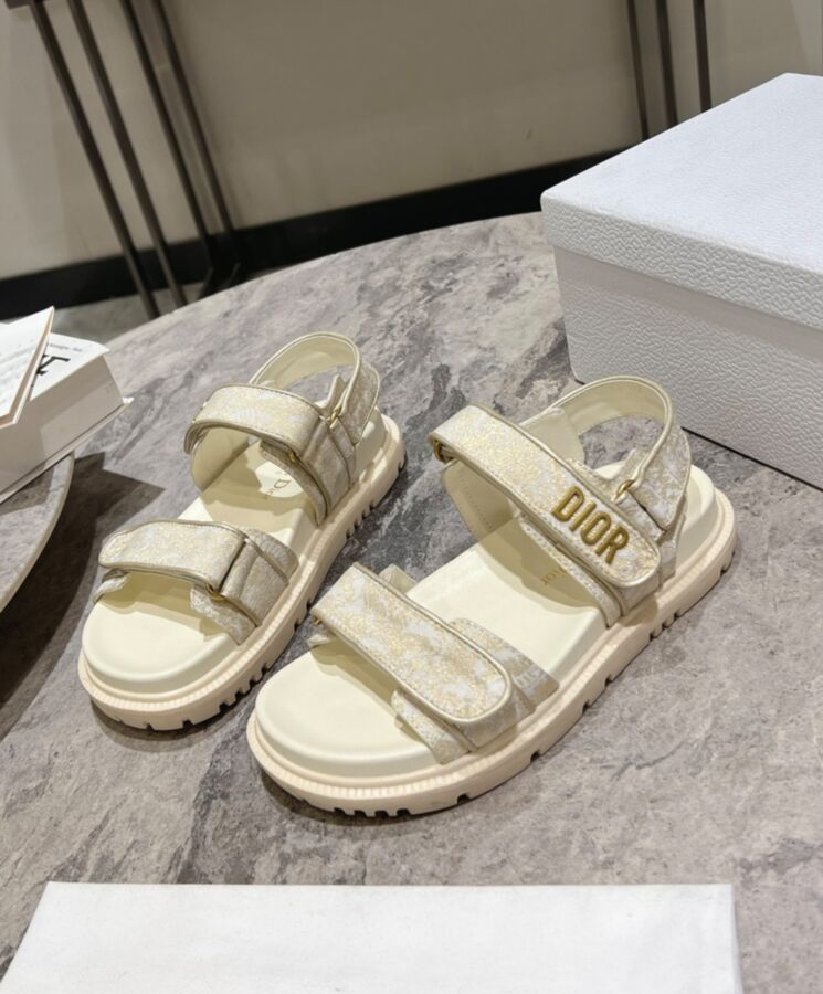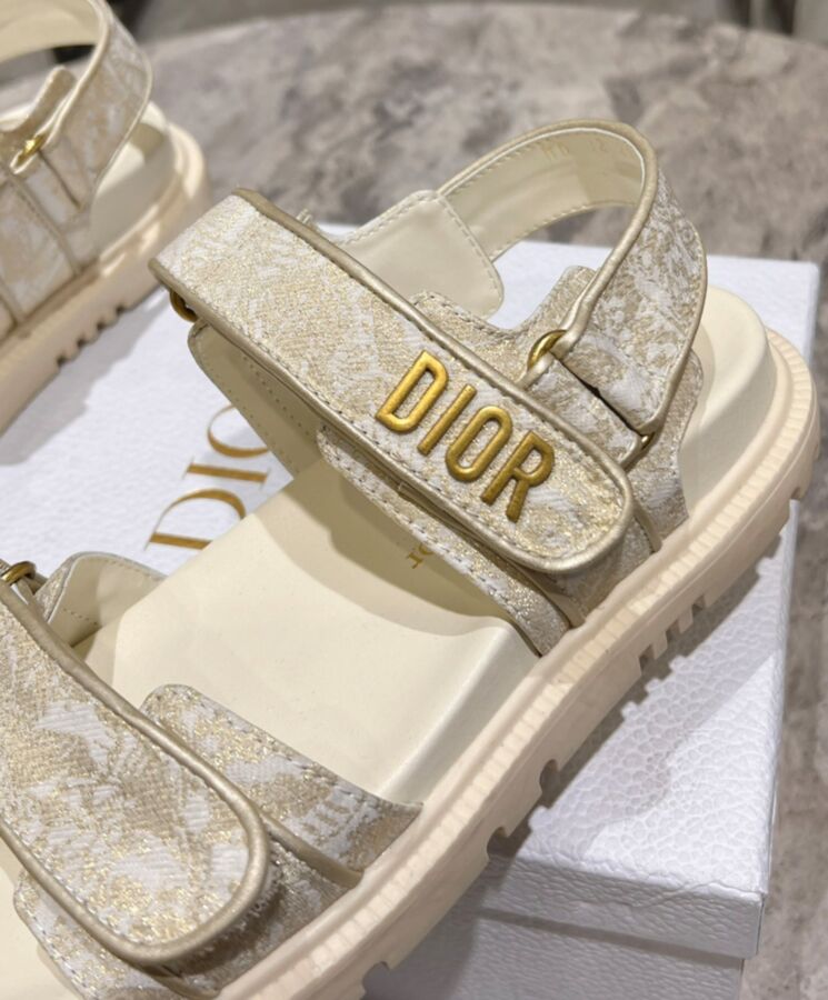 The technical fabric Dioract sandal features the Allover Butterfly motif, showcasing a flight of butterflies. The style features an anatomically shaped sole made with an ultra-lightweight and comfortable leather. Self-fastener straps are further enhanced by a gold-finish metal Dior signature on the upper strap. The sandal will lend a contemporary touch to any look.