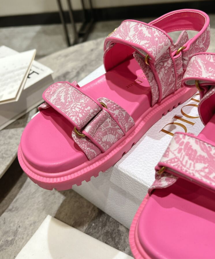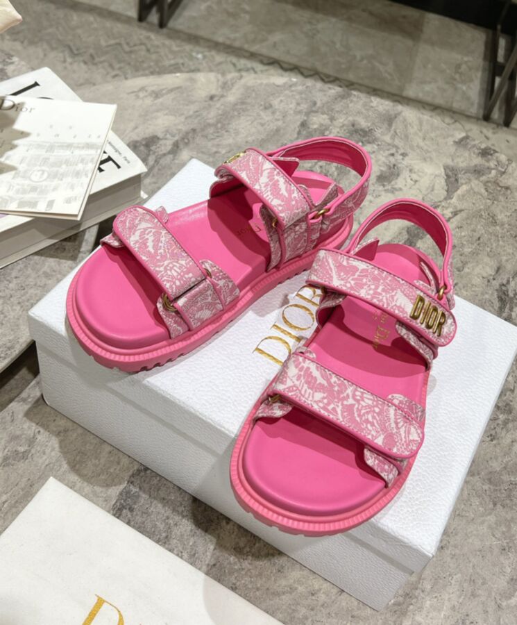 The technical fabric Dioract sandal features the Allover Butterfly motif, showcasing a flight of butterflies. The style features an anatomically shaped sole made with an ultra-lightweight and comfortable leather. Self-fastener straps are further enhanced by a gold-finish metal Dior signature on the upper strap. The sandal will lend a contemporary touch to any look.