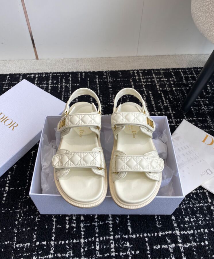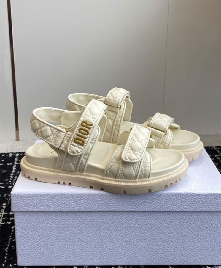 The Dioract sandal presents a modern silhouette in calfskin quilted with the Cannage motif. The style features an anatomically shaped sole made with ultra-lightweight and comfortable leather. Self-fastening straps further enhanced by a gold-finish metal Dior signature on the upper strap complete the design. The sandal will lend a contemporary touch to any look.