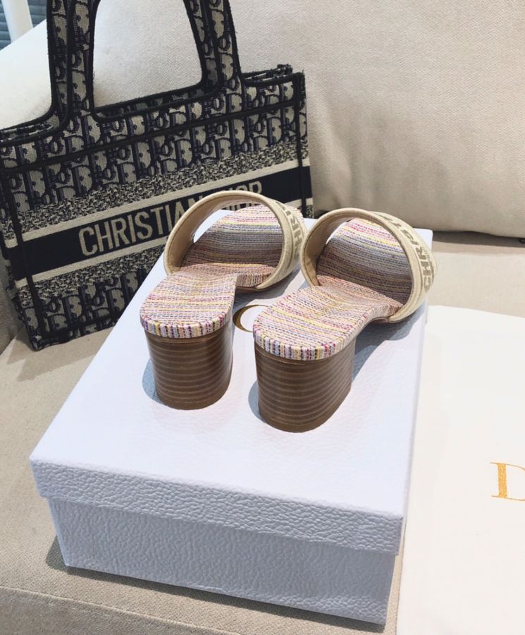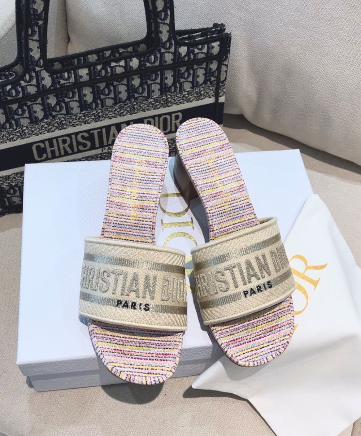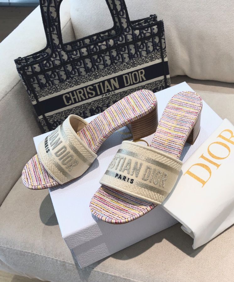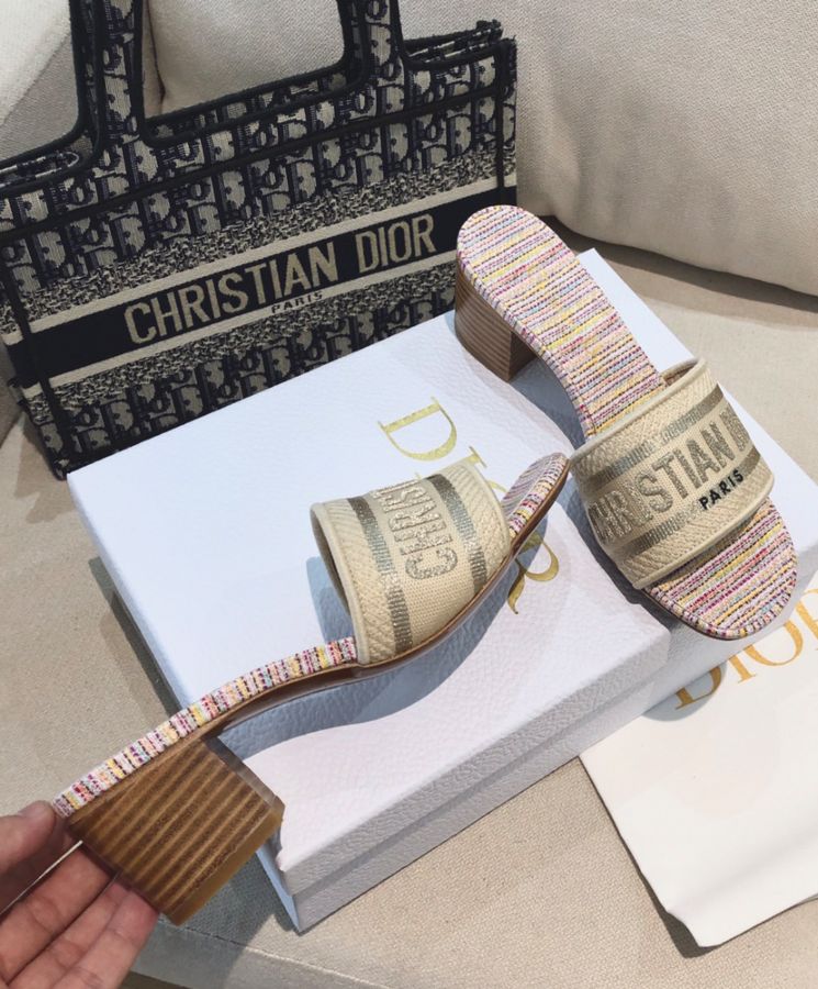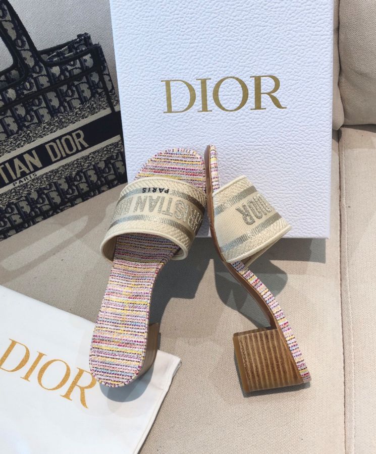 The Dway slide, a timeless and hallmark piece, is part of the Dior Gold capsule collection. The upper is embroidered with gold-tone metallic thread cotton and embellished with a Dior signature. Completed with a 4 cm block heel, the slide may be coordinated with other Dior Gold creations.