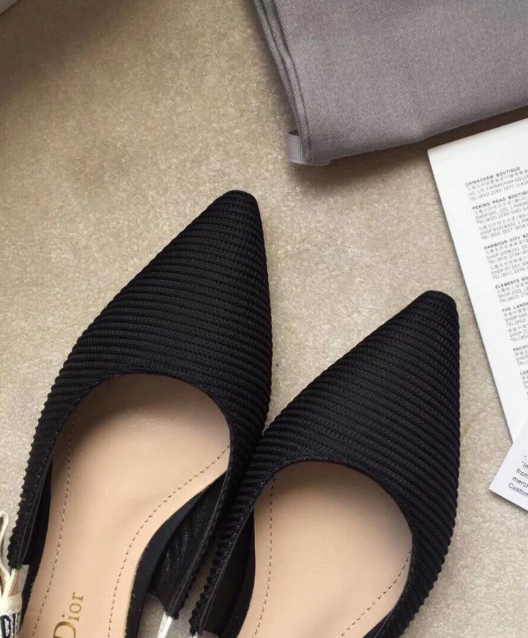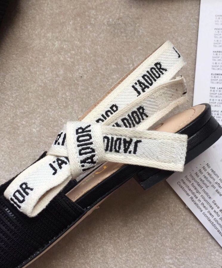 Sling-back ballet pump in black technical fabric, embroidered ribbon, 1 cm heel. J’Adior embroidered ribbon Flat bow Leather sole with star accessory, one of Dior’s favourite symbols Heel, 1 cm
