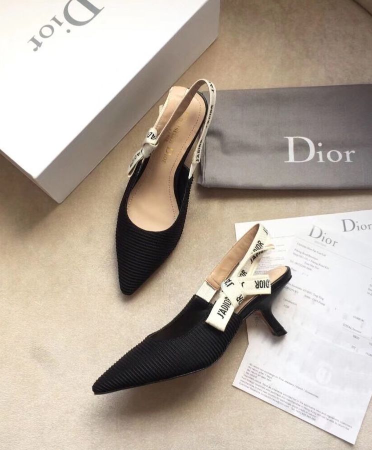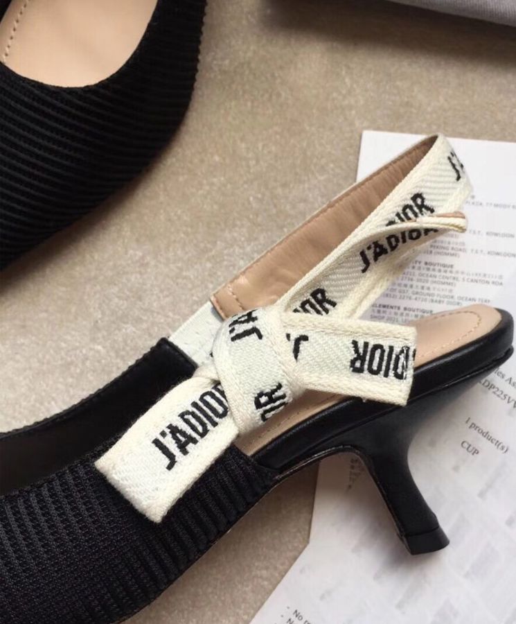 Slingback pump in black technical fabric, embroidered ribbon, 6.5 cm comma heel. J’Adior embroidered ribbon Flat bow Leather sole with star accessory, one of Dior’s favourite symbols Heel, 6.5 cm