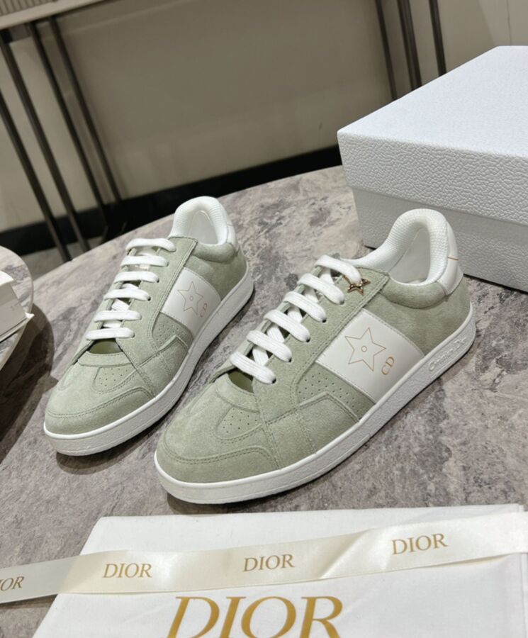 The Dior Star sneaker, a House essential, is distinguished by its timeless lines. The suede calfskin upper is enhanced by a white calfskin insert embellished with a gold-tone CD signature and star. Gold-tone Dior Star and Dior Paris signatures adorn the style, while a gold-finish metal star elevates a lacing eyelet. Completed by a thin signature sole, the lightweight sneaker will give the finishing touch to any relaxed outfit, any time of year.