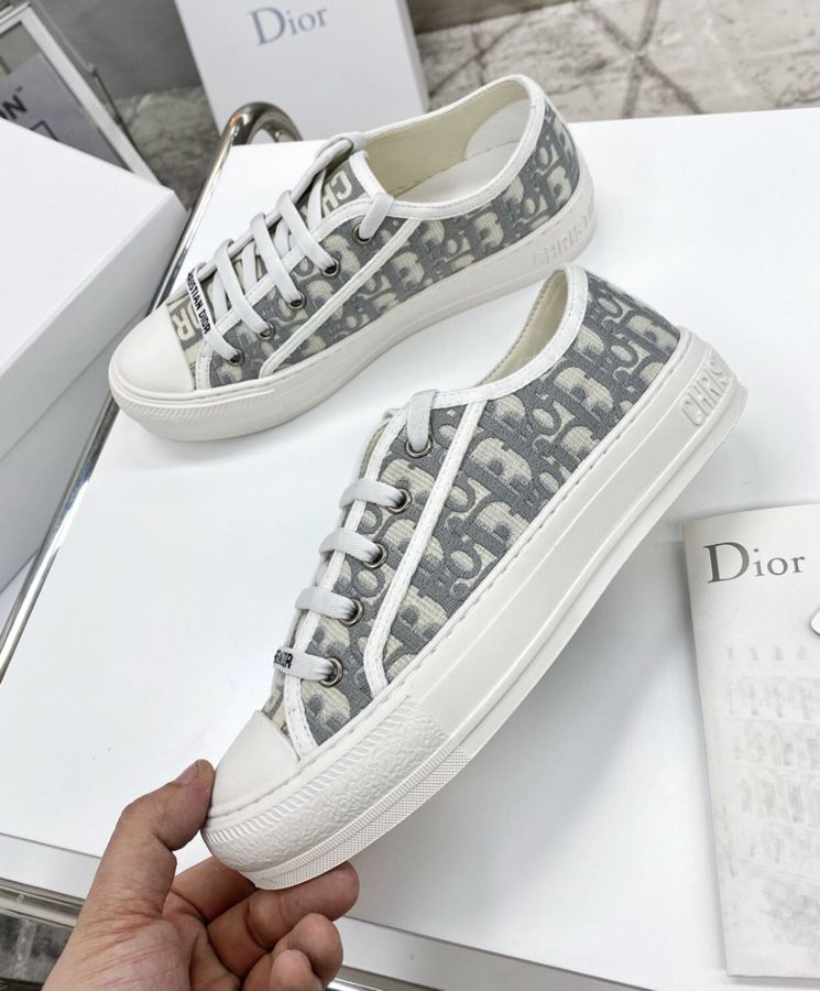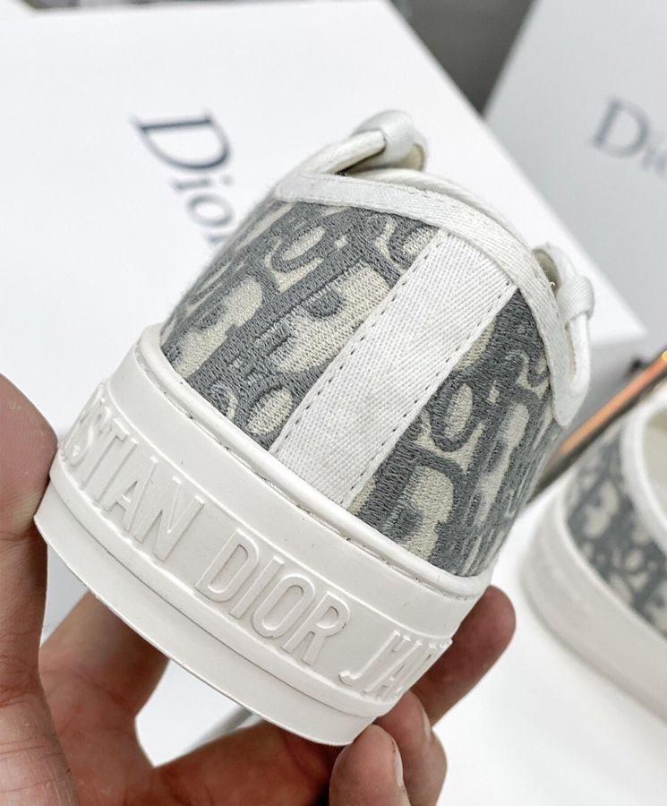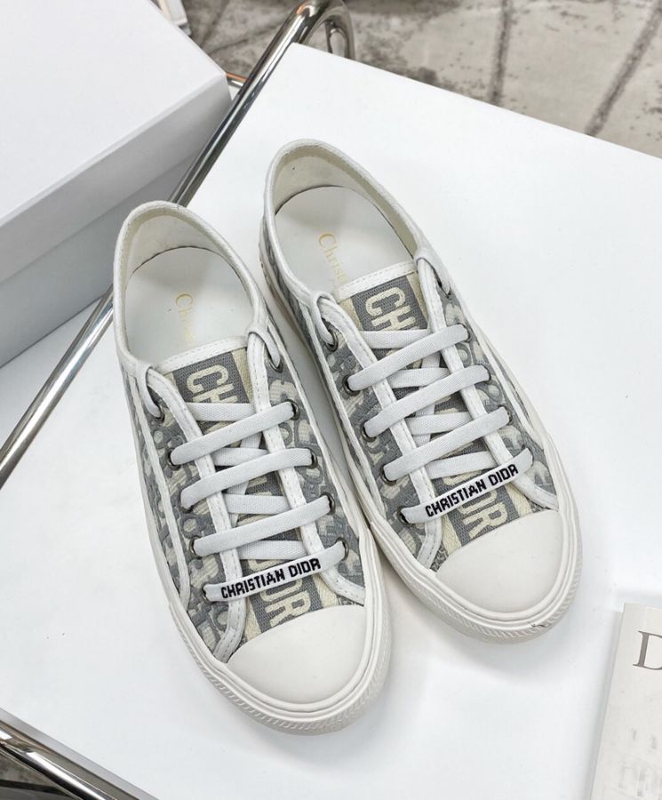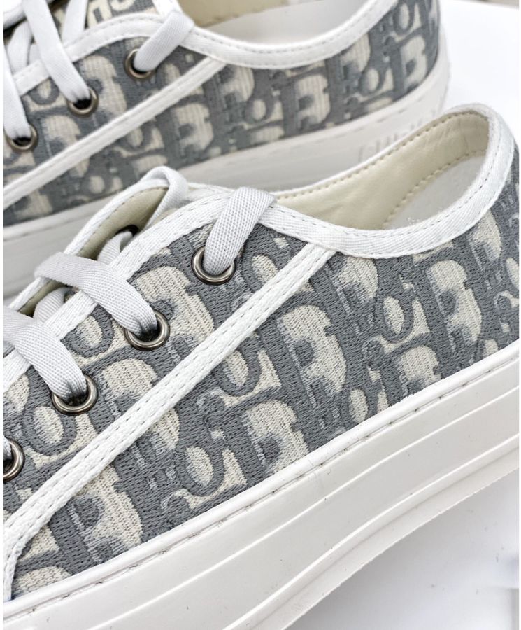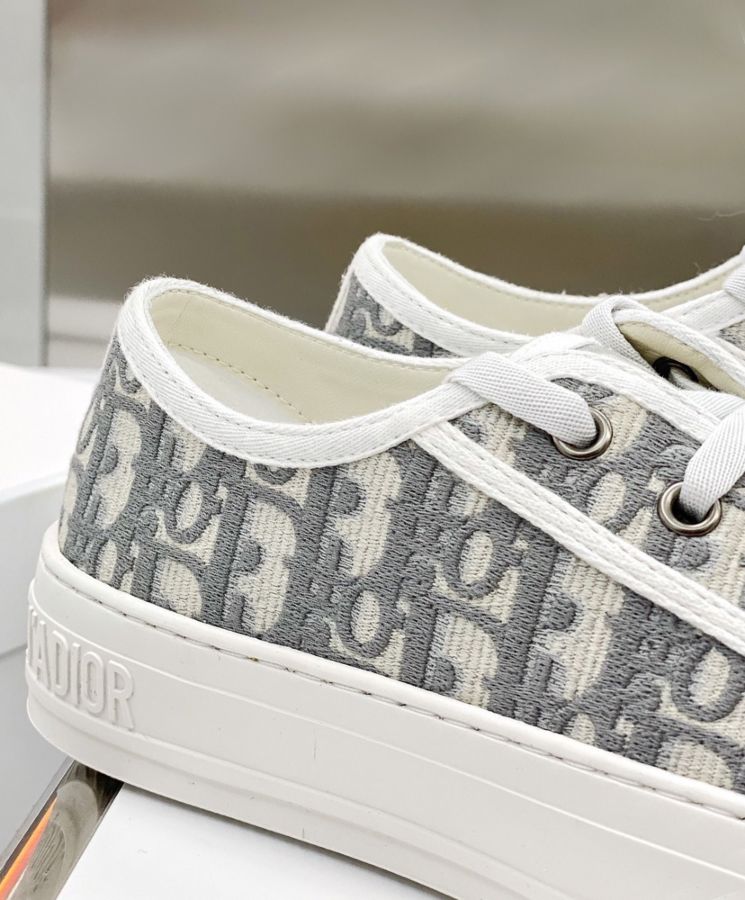 The Walk’N’Dior sneaker presents a gray embroidered cotton Dior Oblique motif. Its relaxed design features signatures on the tongue, rubber sole and laces for a timeless look.