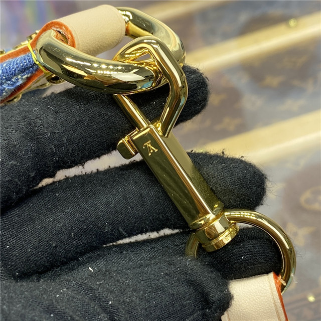 Made from Monogram Denim, the High Rise bumbag is trimmed with natural leather. Notably around the zipper, where the cowhide is adorned with golden studs. A removable name tag, also in distressed Monogram Denim, adds a distinctive touch. The removable and adjustable textile strap gives carry options.