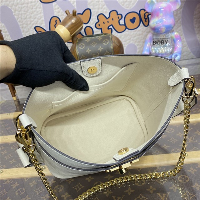 The Lock and Walk is a sleek bucket bag fashioned from grained calf leather. Lightweight and comfortable to carry, the bag combines casual ease with Parisian chic. A large front compartment secured with the LV turn lock provides convenient access to essential belongings. The detachable smart strap and golden chain handle provide for different carry styles.