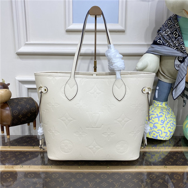 The Neverfull MM tote bag is made from grained Monogram Empreinte leather, with gold-color hardware and a tone-on-tone microfiber lining. A zipped pocket inside can be removed and used separately. The side laces can be tightened for a sleeker look or loosened for more casual use.
