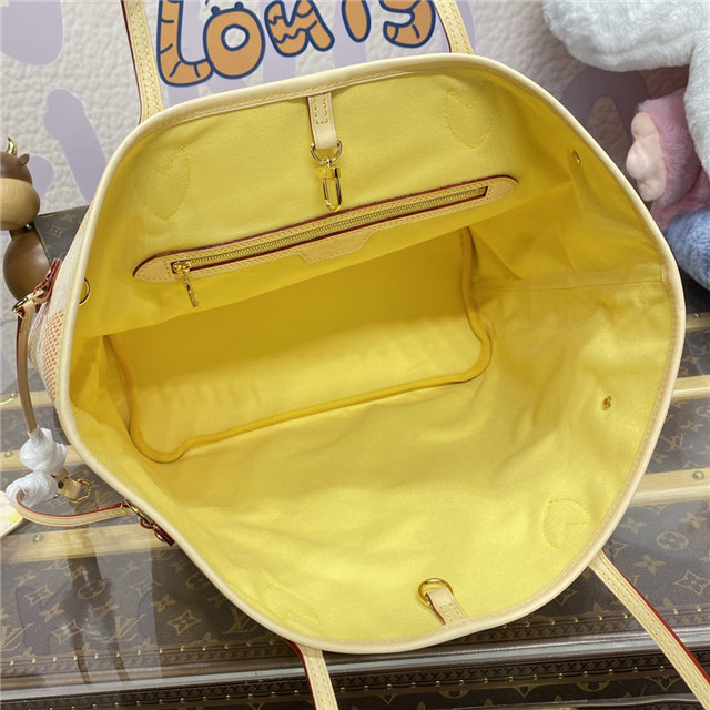 This roomy Neverfull MM tote is made from Damier Giant canvas, playfully updated in a colorway combining four different pastel tones. This functional carryall can be cinched closed with its side laces or left open for a more casual look. Inside, there’s a removable zipped pouch in matching canvas that can be used separately.
