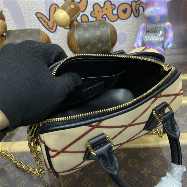 This finely crafted edition of the Speedy 20 Bandoulière handbag is fashioned from luxe beige lambskin, embellished with the House’s iconic Malletage pattern in contrasting deep red. In addition to its Toron top handles, this model is fitted with a removable chain-and-leather strap, for enhanced versatility. The double zip closure is ornamented with a signature golden padlock.