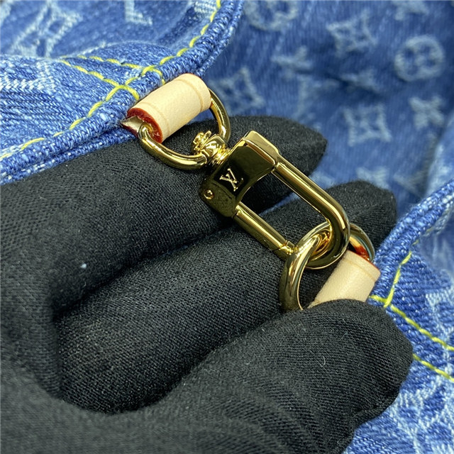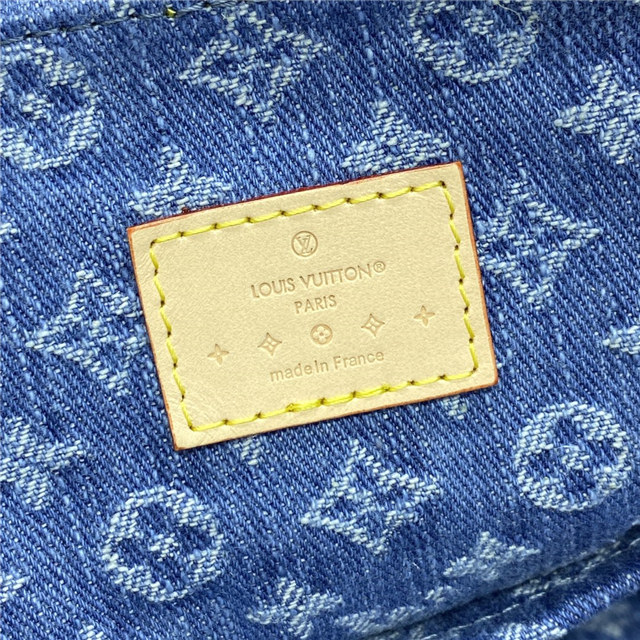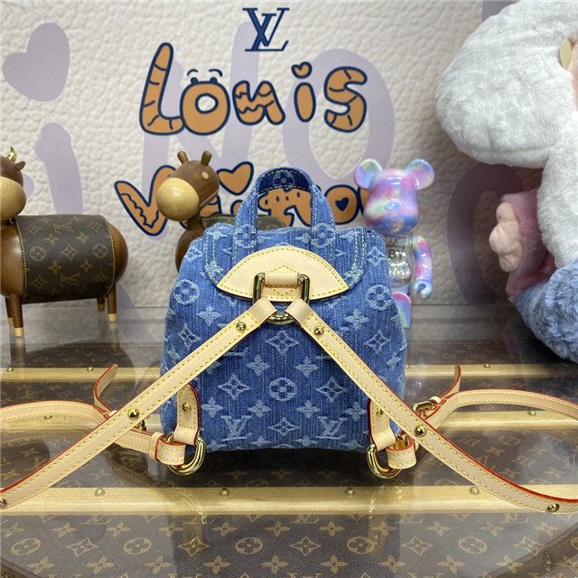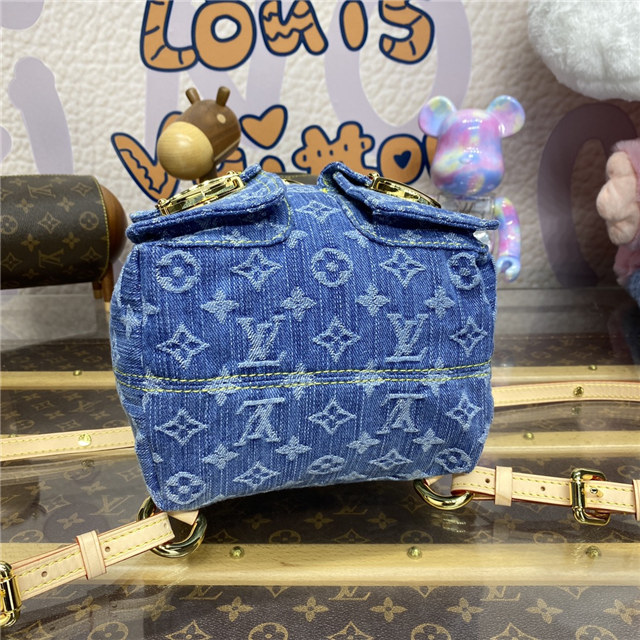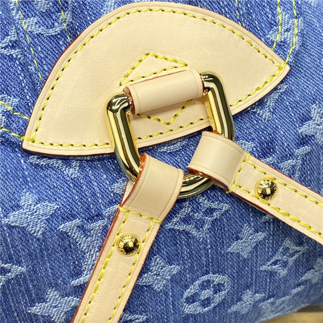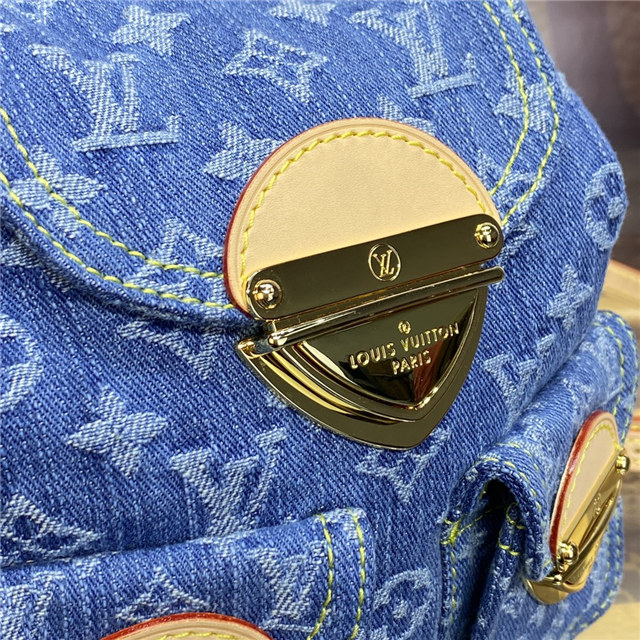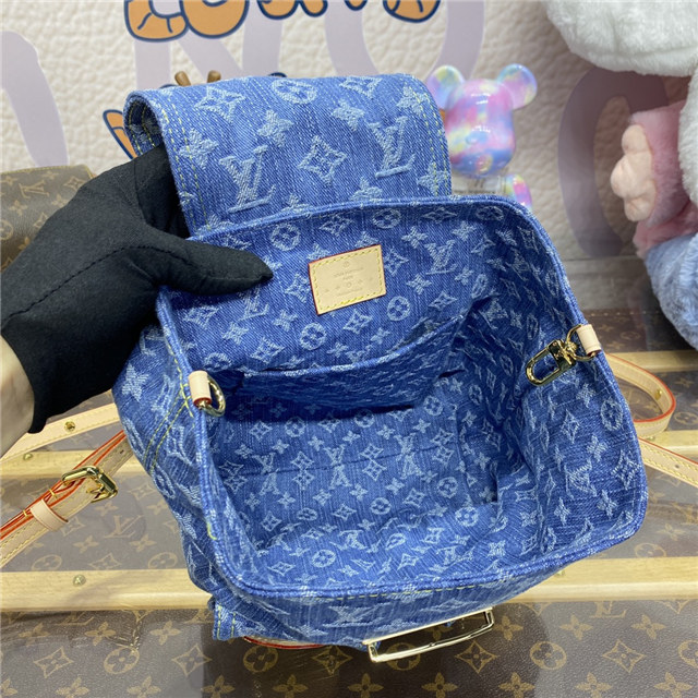 This small backpack bag, the Venice, is made from Monogram Denim. It features three golden tuck locks, one on the flap and one on each of the two outside front pockets. Large enough for daily essentials, it fits an iPhone 14 Pro Max, keys, a wallet, earbuds, and a sunglasses case.