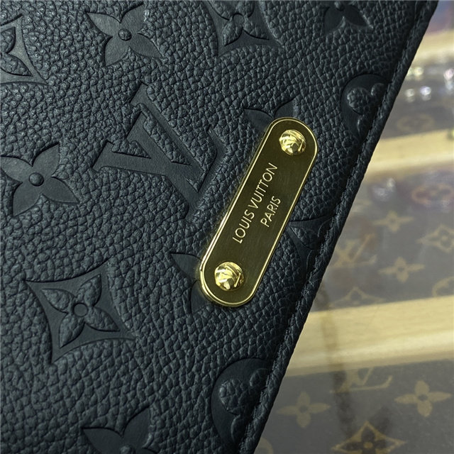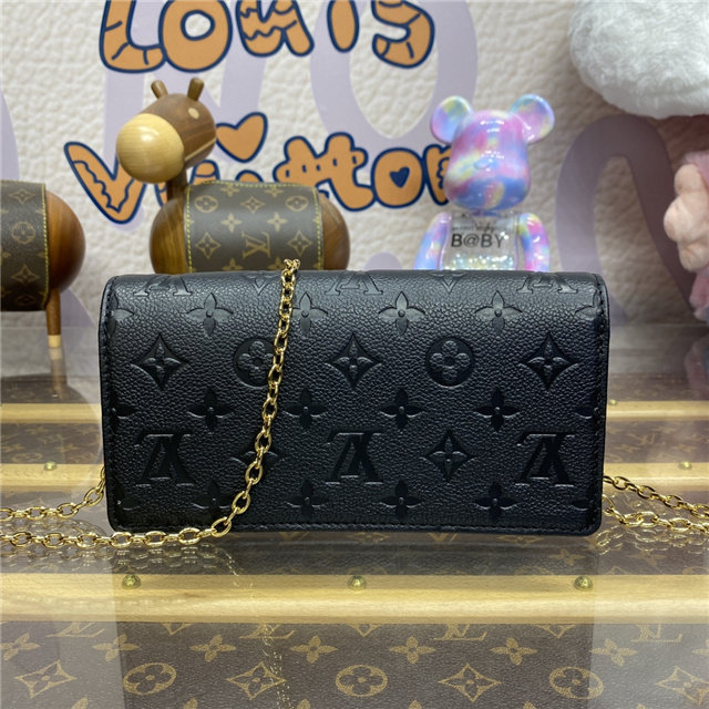 The Lily wallet on chain is crafted from supple, grained Monogram Empreinte leather. This tiny flap bag, which will hold essentials for day or evening, combines a sleek rectangular shape with a subtle retro look. It is complemented by gold-tone hardware, notably a Louis Vuitton-engraved plate and a removable, adjustable chain with an LV Circle charm.