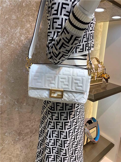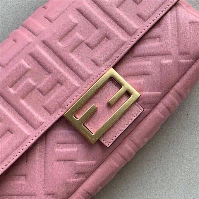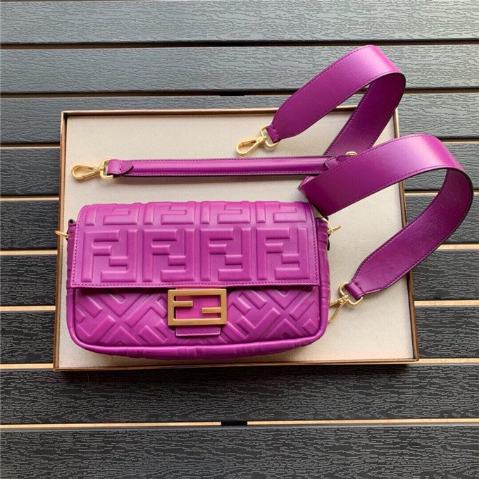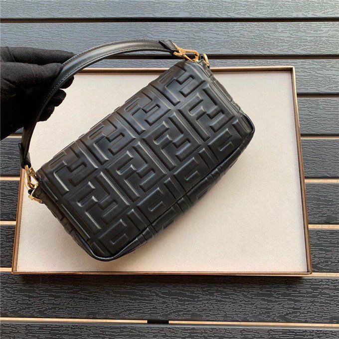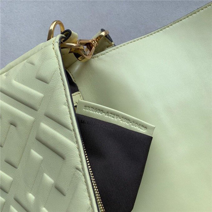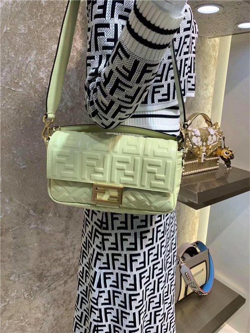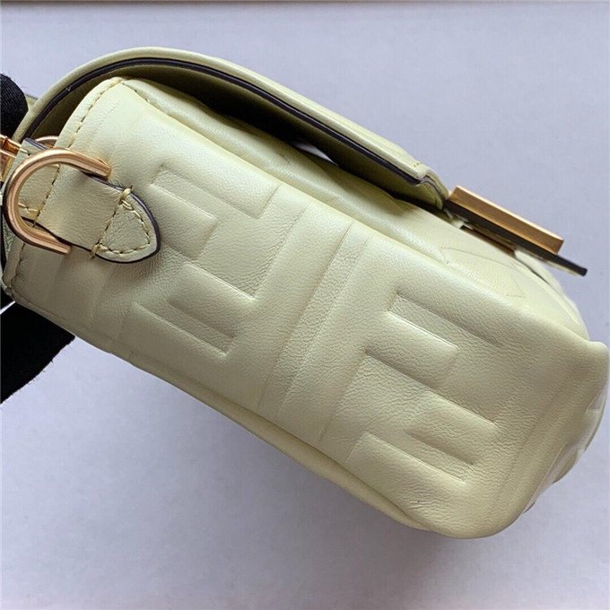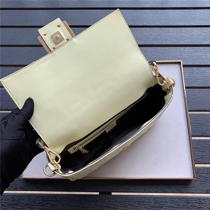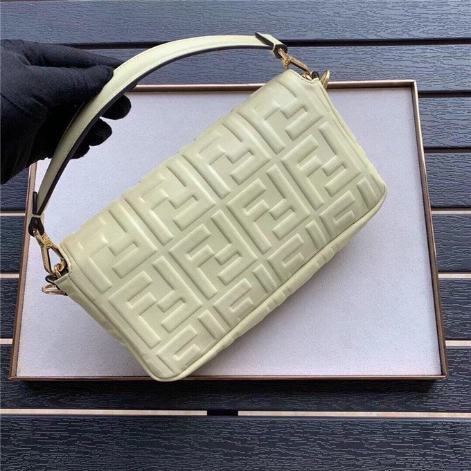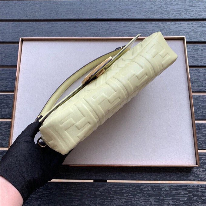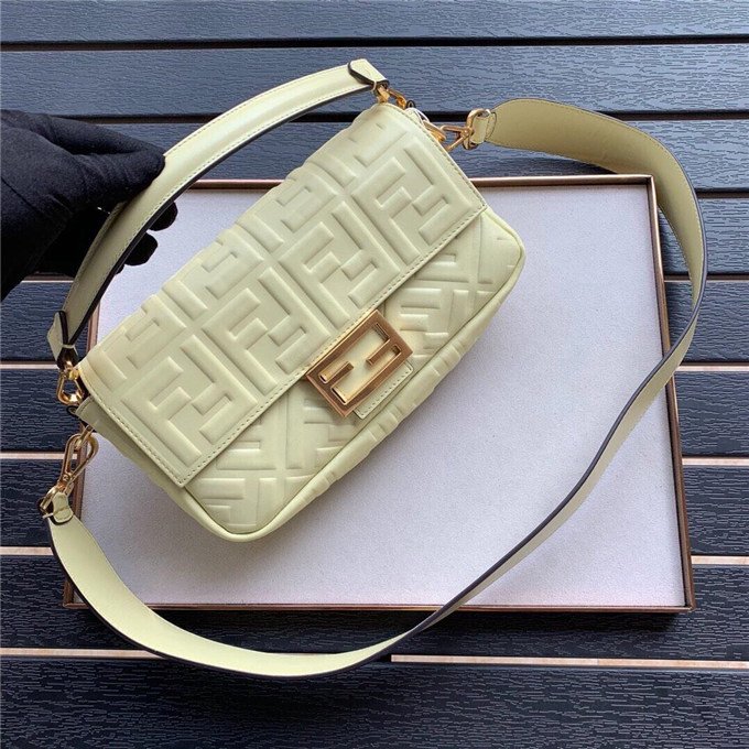 Iconic Baguette bag in medium size, with flap and FF fastening with magnetic clasp. Lining with zip pocket. Can be carried by hand or worn cross-body thanks to its handle and shoulder strap, both detachable. Made of Yellow lambskin with an all-over FF motif in a soft, three-dimensional texture. Gold-finish metalware.
