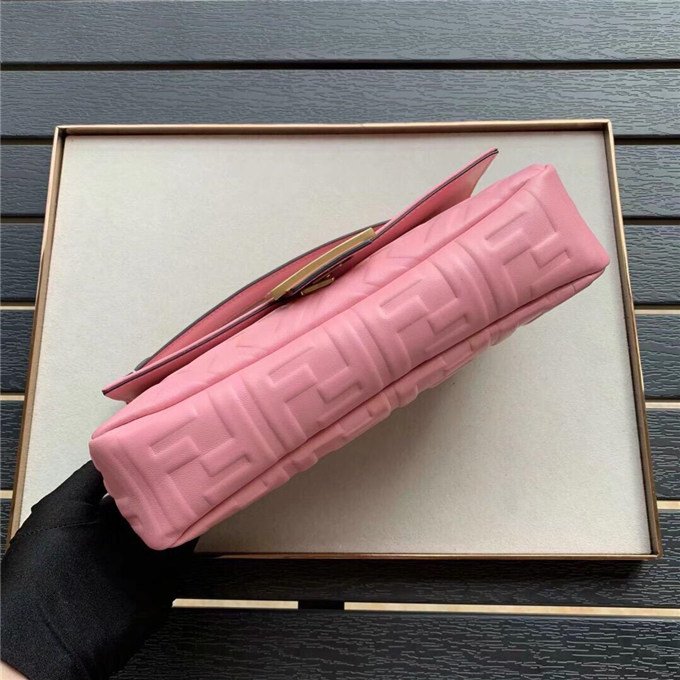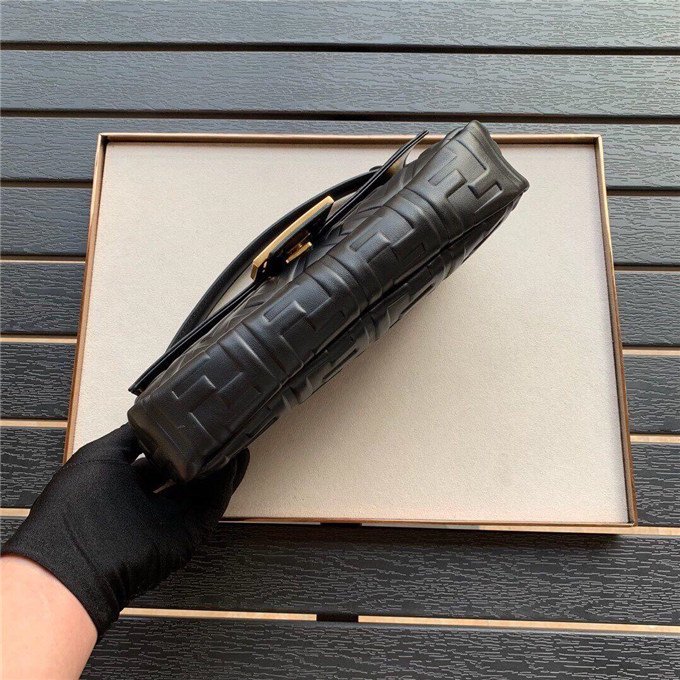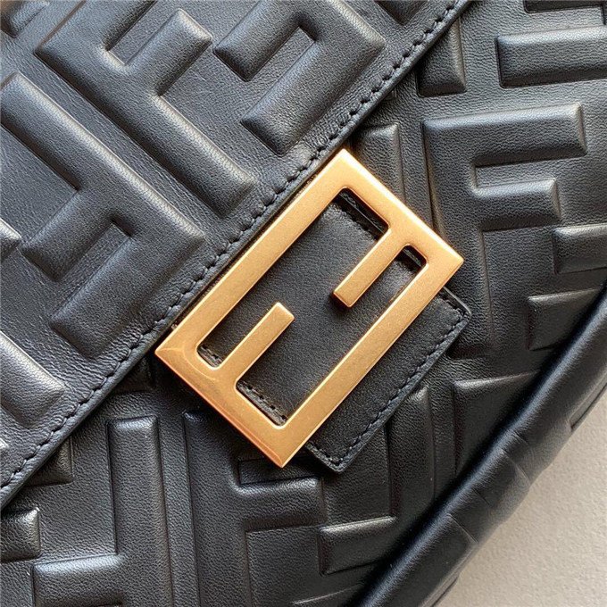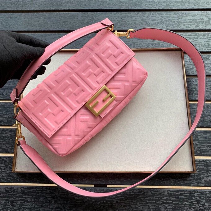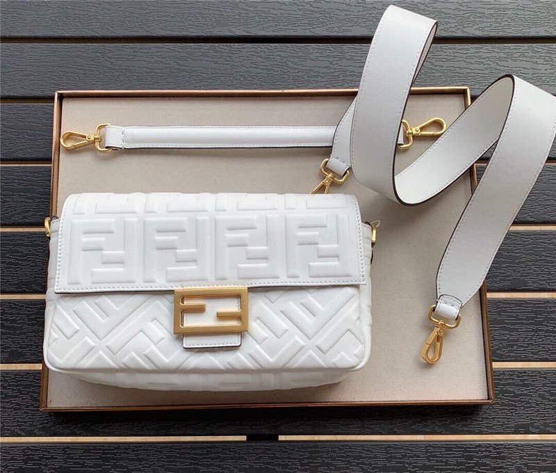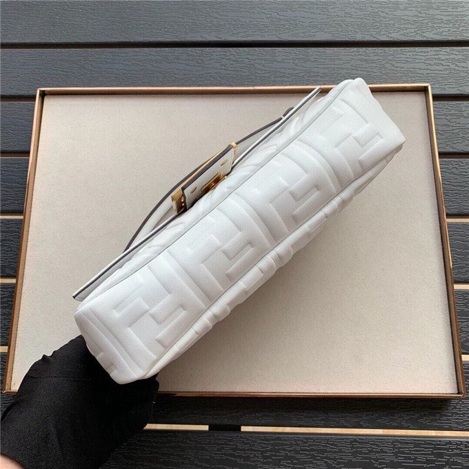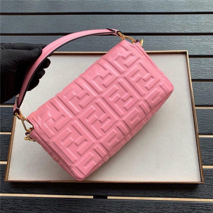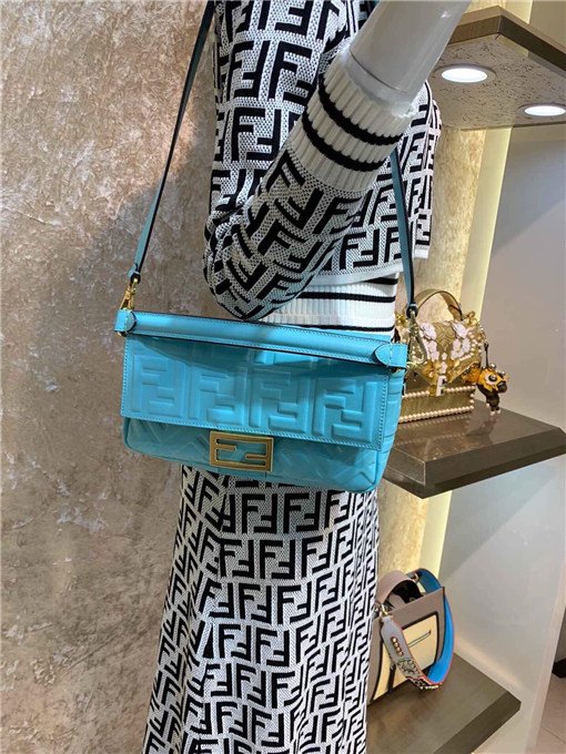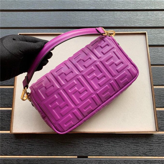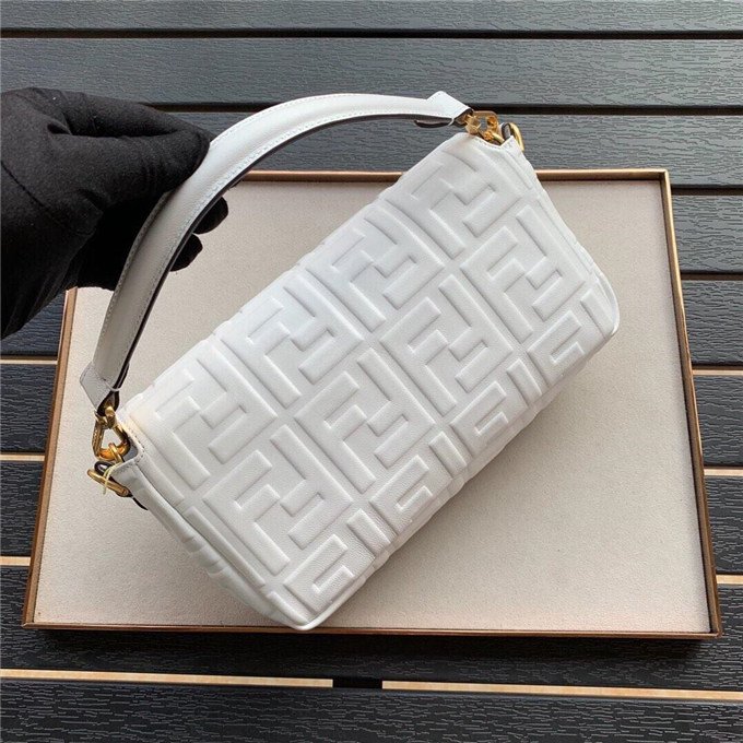 Iconic Baguette bag in medium size, with flap and FF fastening with magnetic clasp. Lining with zip pocket. Can be carried by hand or worn cross-body thanks to its handle and shoulder strap, both detachable. Made of Yellow lambskin with an all-over FF motif in a soft, three-dimensional texture. Gold-finish metalware.