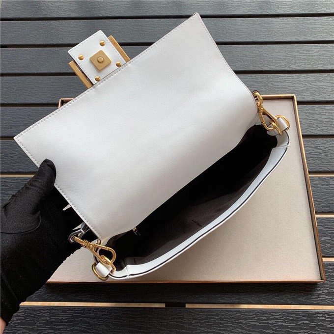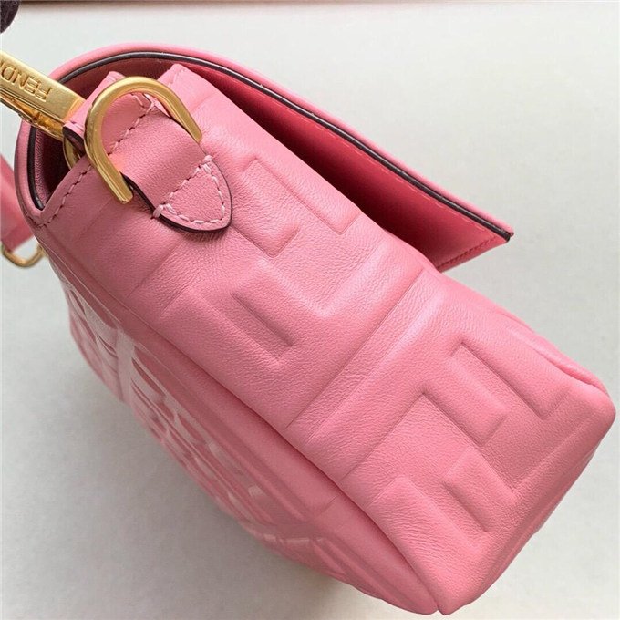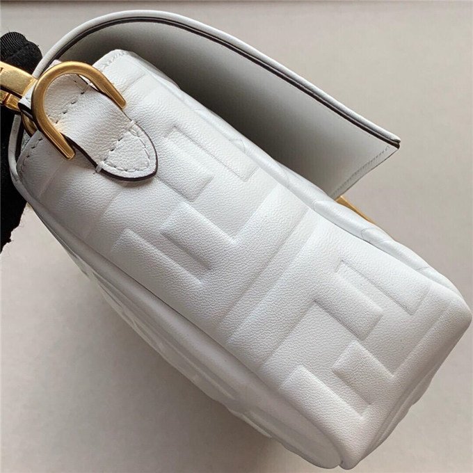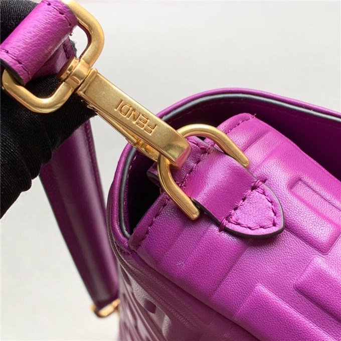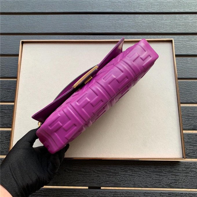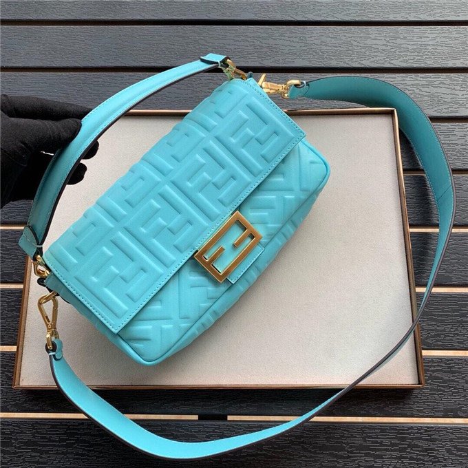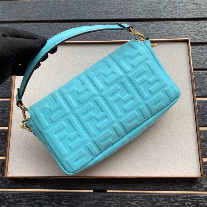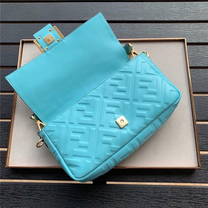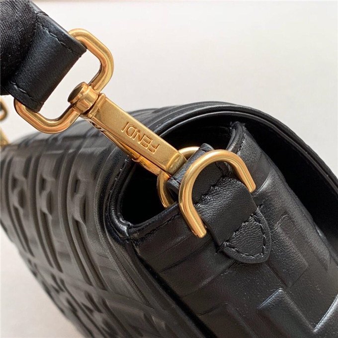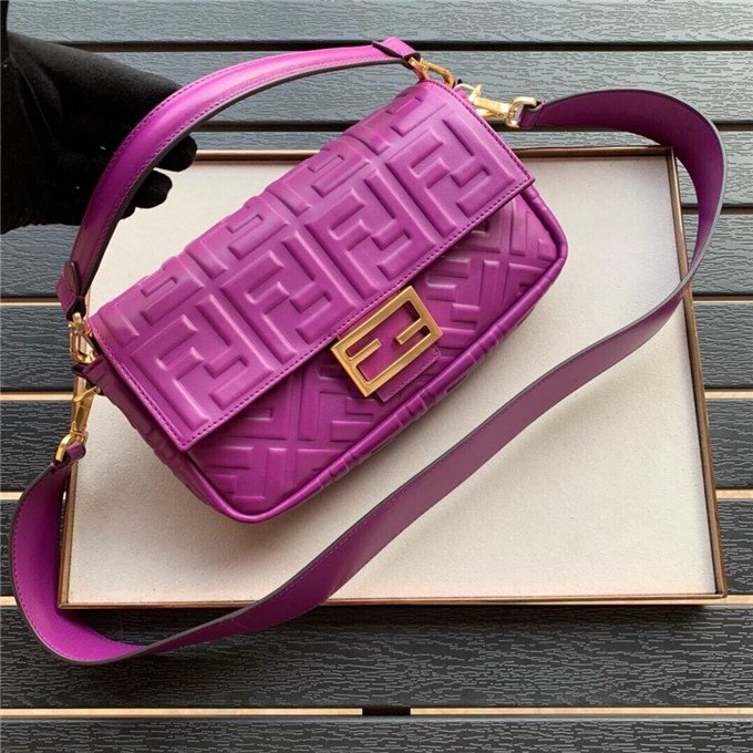 Iconic Baguette bag in medium size, with flap and FF fastening with magnetic clasp. Lining with zip pocket. Can be carried by hand or worn cross-body thanks to its handle and shoulder strap, both detachable. Made of Yellow lambskin with an all-over FF motif in a soft, three-dimensional texture. Gold-finish metalware.