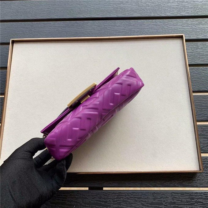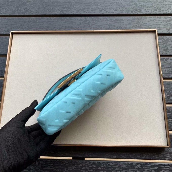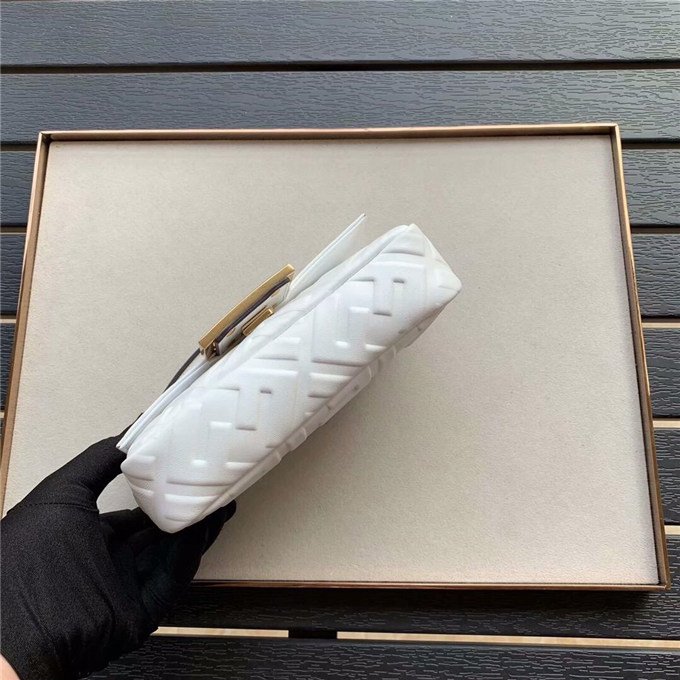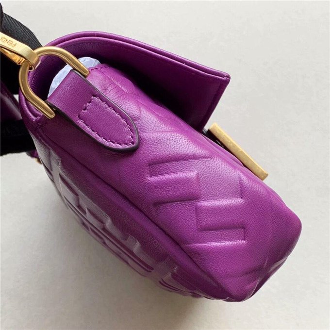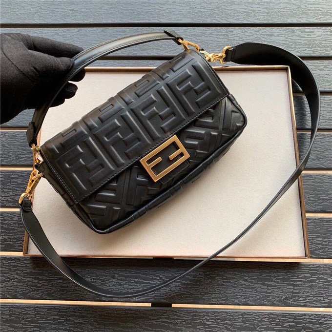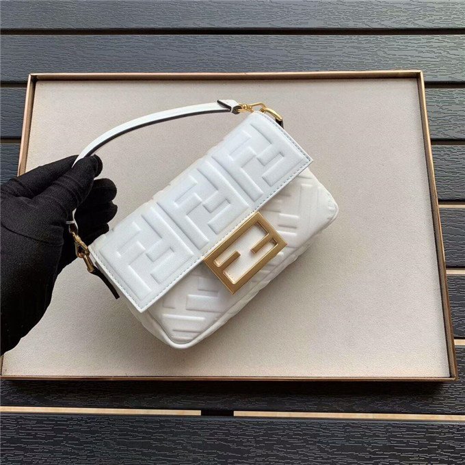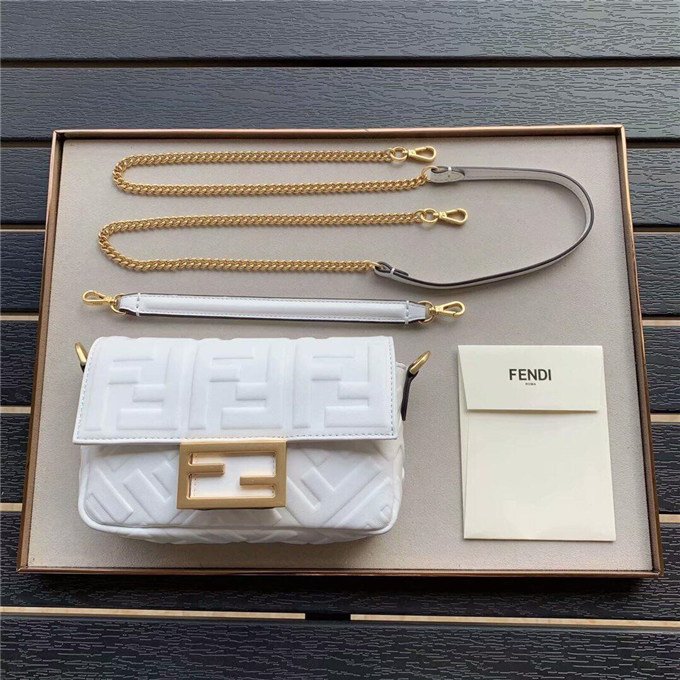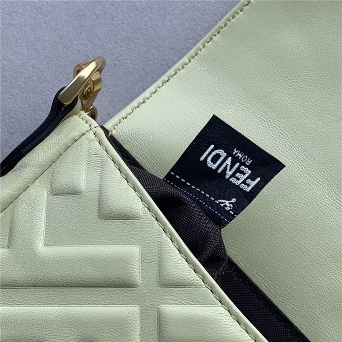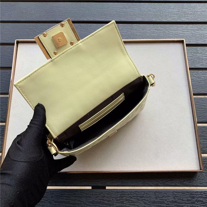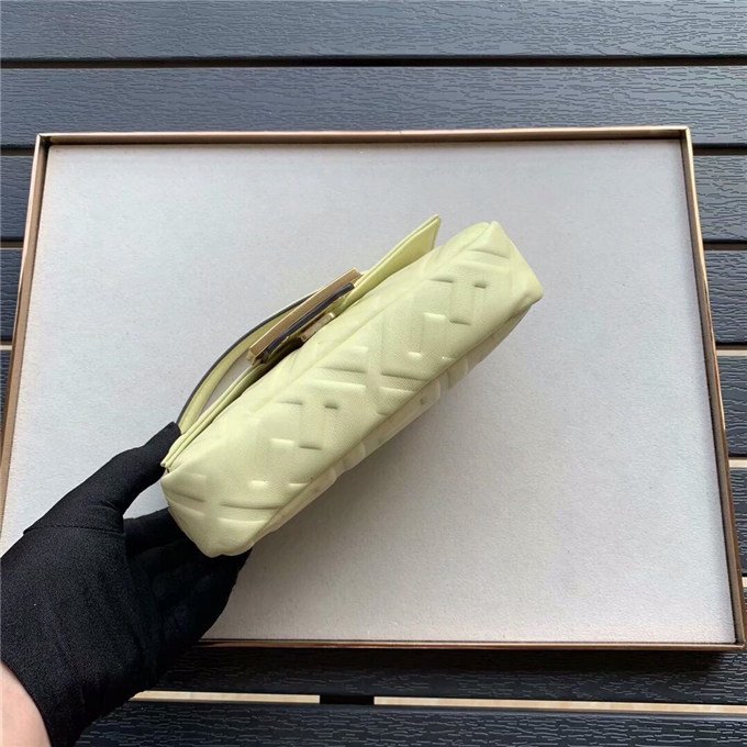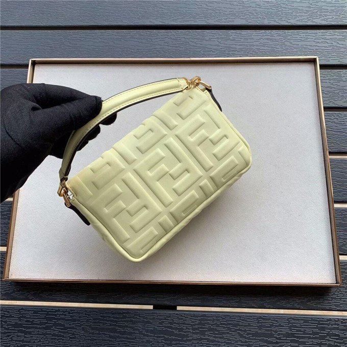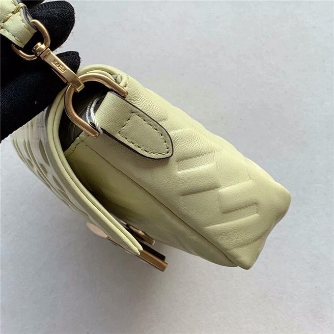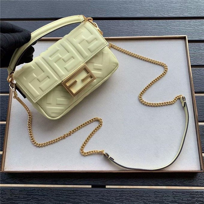 Iconic Baguette bag in mini size, with flap and FF magnetic clasp fastening. Features a long adjustable and detachable chain and leather shoulder strap. Made of Yellow nappa calfskin with all-over FF motif in a soft, 3D texture. Gold-finish metalware.