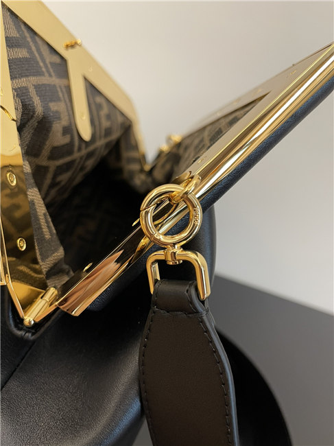 Medium Fendi First bag made of soft, black nappa leather with oversized metal F clasp bound in tone on tone nappa leather.