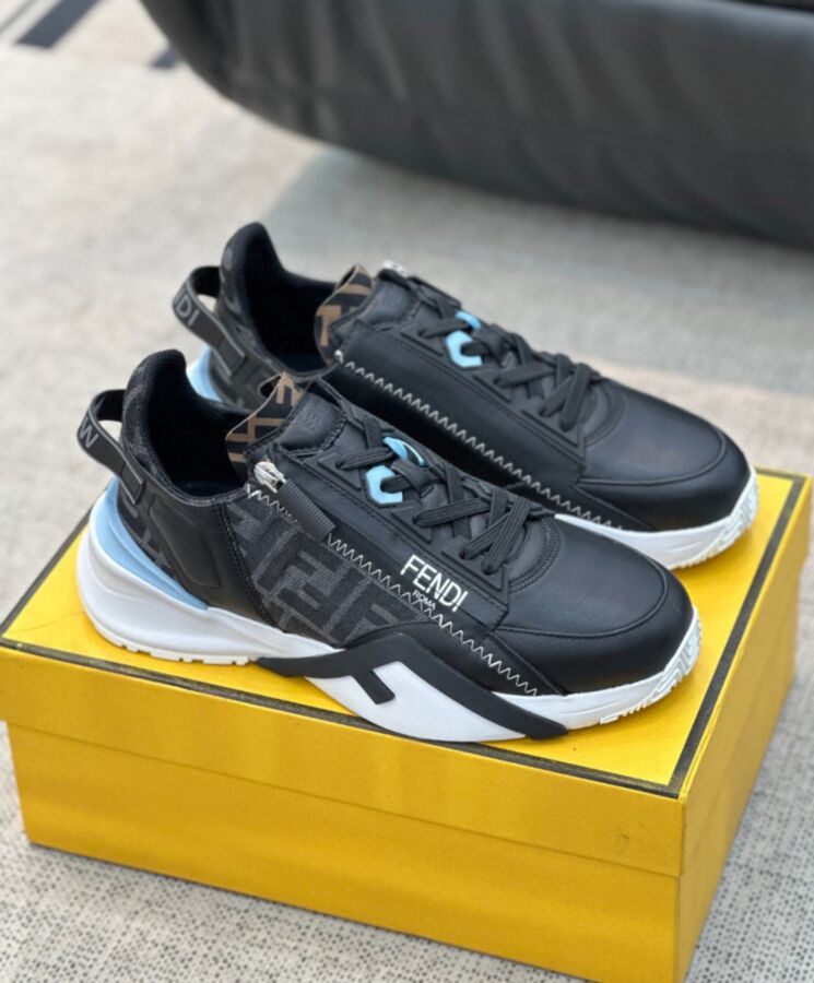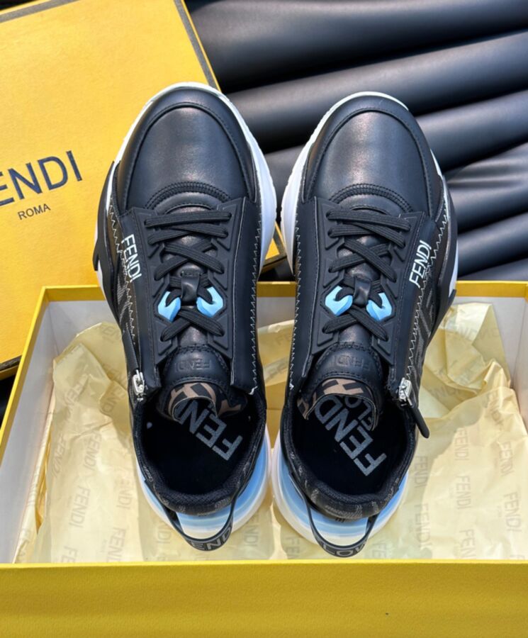 Fendi Flow sneakers with adjustable elastic laces and side zip fastening. Branded with FF pattern on the tongue and rubber tab with embossed logo on the back of the heel. Made of leather. FF fabric detailing. 35 mm running sole with diagonal F detail.