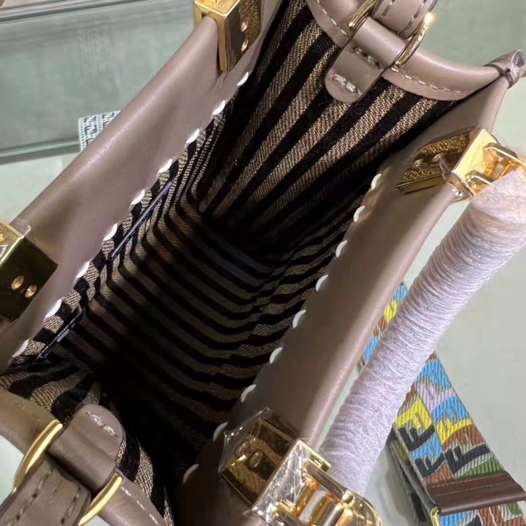 Mini Sunshine Shopper bag made of gray leather with FENDI ROMA lettering in python-look printed elaphe and stiff tortoiseshell-effect plexiglass handles.