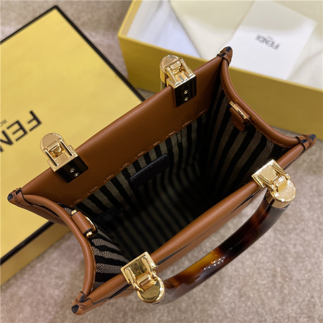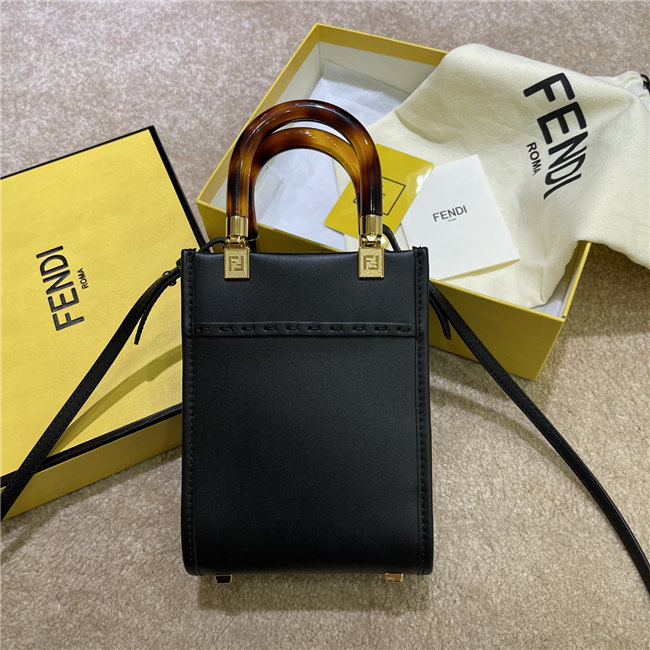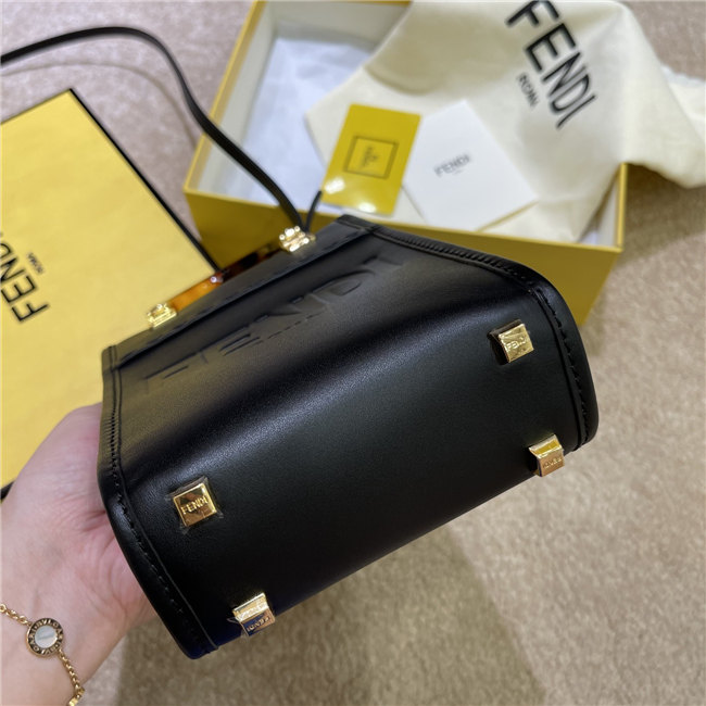 Mini Sunshine Shopper bag made of Black leather with hot-stamped “FENDI ROMA” and stiff tortoiseshell effect plexiglass handles.