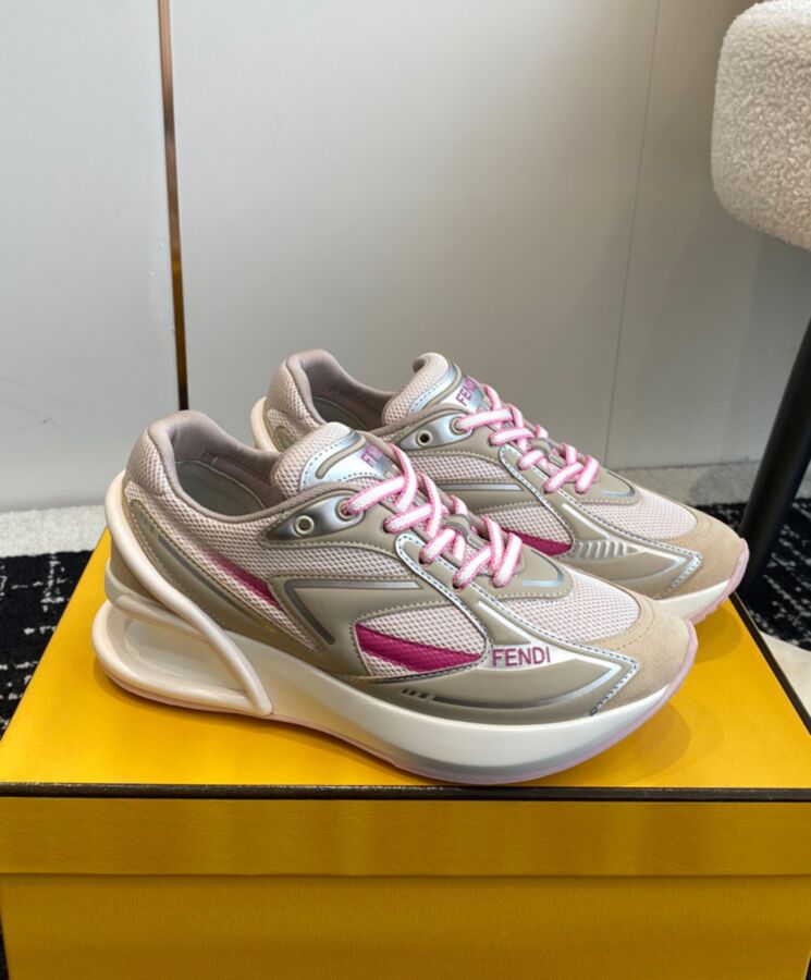 First 1 sneakers featuring laces and corrugated soles with a diagonal F-shaped sculpted detail. Made of tech fabric. Framilon inserts. Customised with screen-printed Fendi lettering on the tongue and the side.