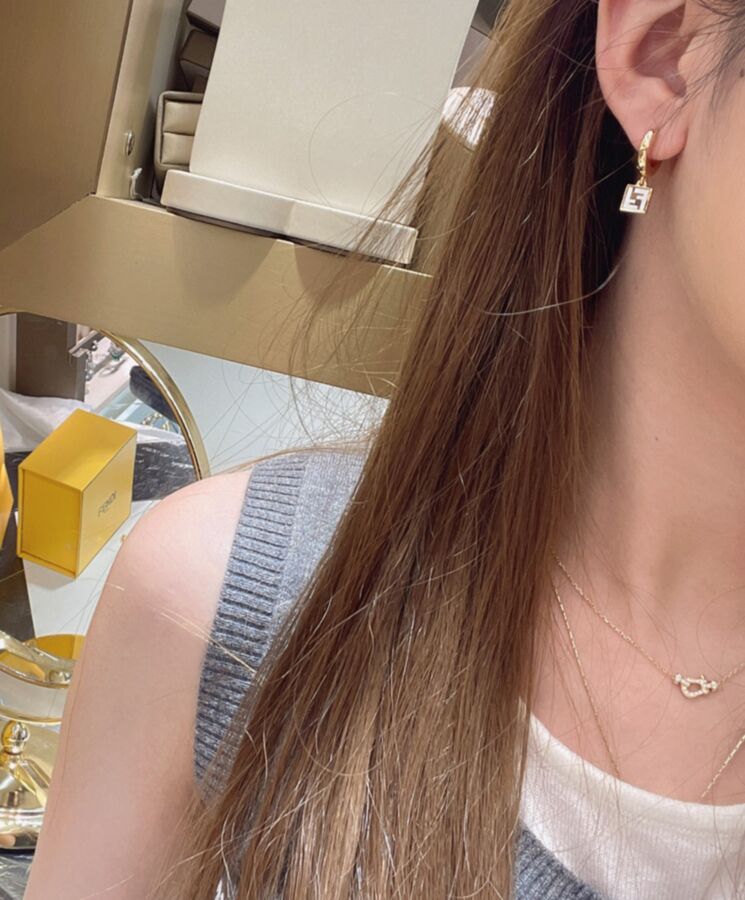 Hoop earrings with small square pendant. Made of metal with a gold finish. Decorated with FF motif enamelled.