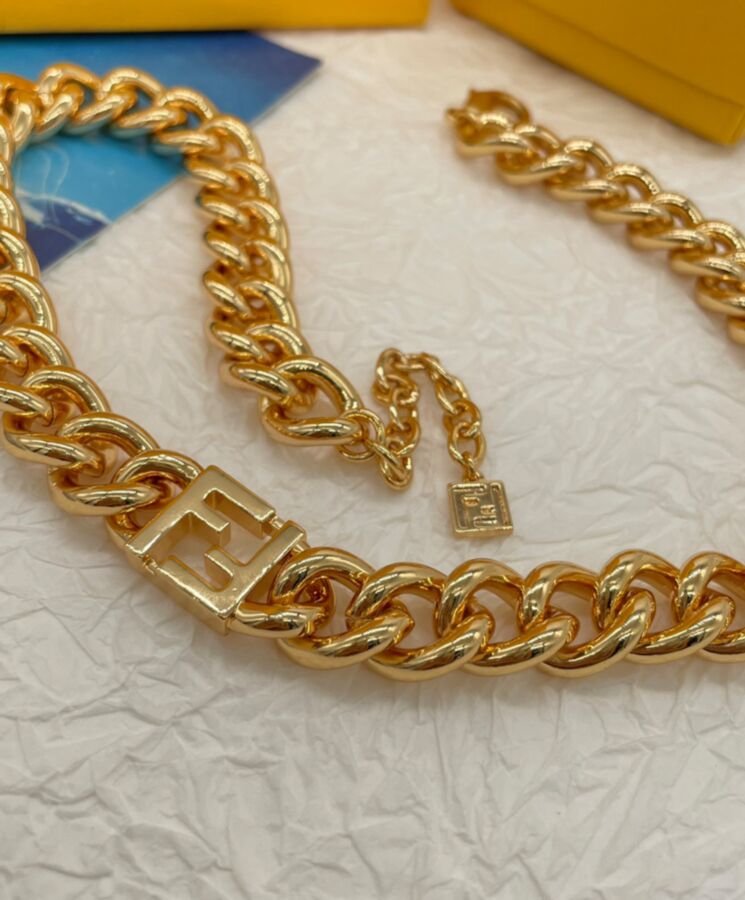 Necklace with chunky link chain and FF motif. Closure with small clip. Made of gold-finish metal.