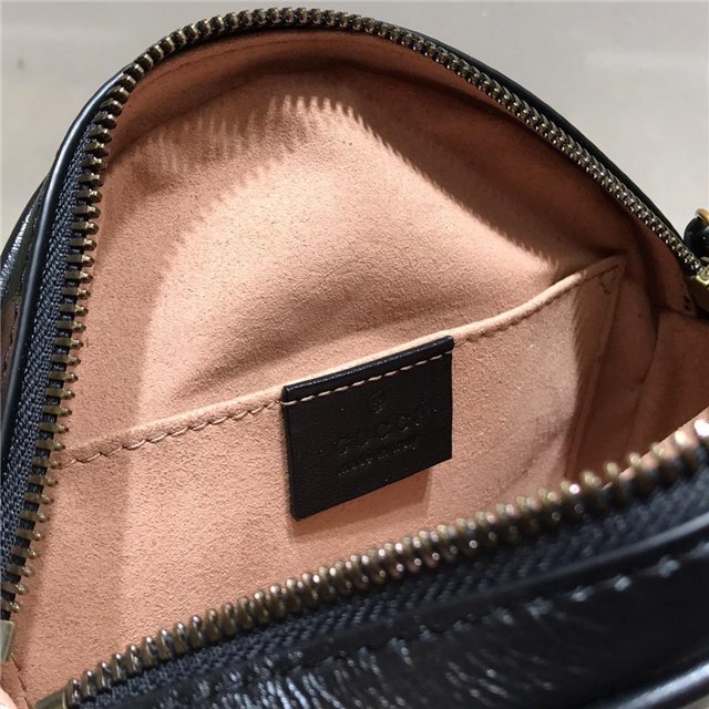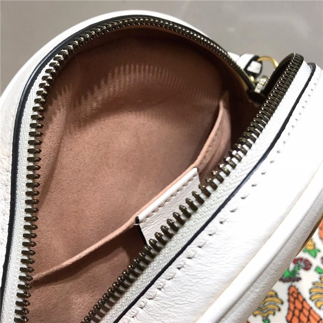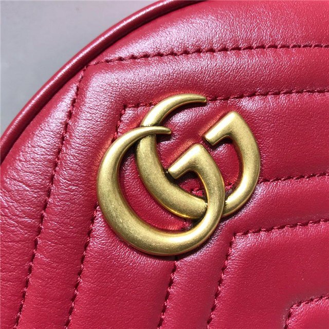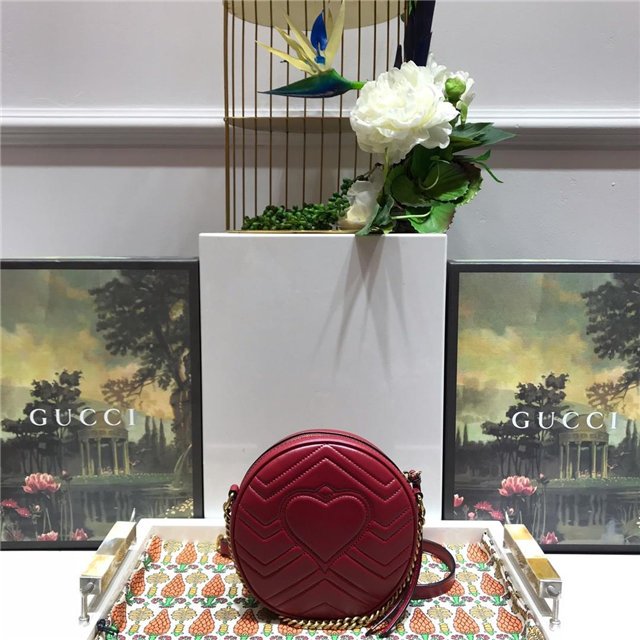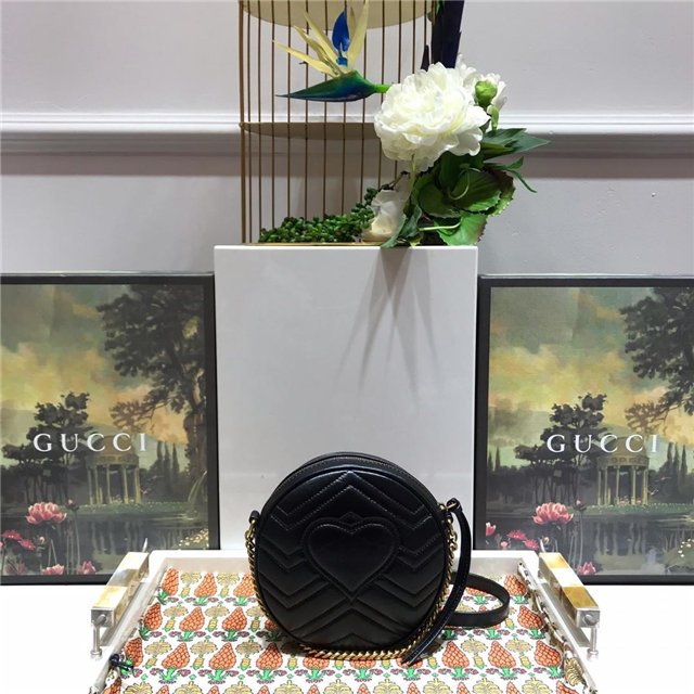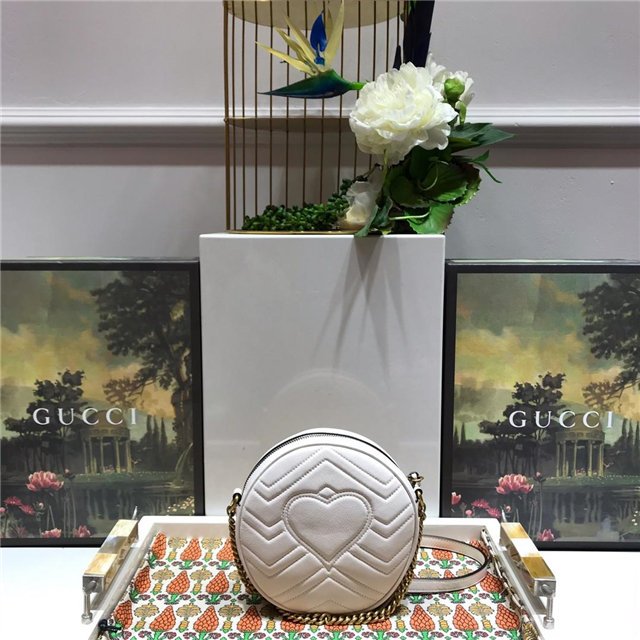 A new introduction to the GG Marmont line for Cruise 2019, the mini bag is presented in a rounded shape with a chain shoulder strap. Defined by the distinctive Double G hardware, made in matelassé chevron leather with a heart on the back, finished with a vintage effect.