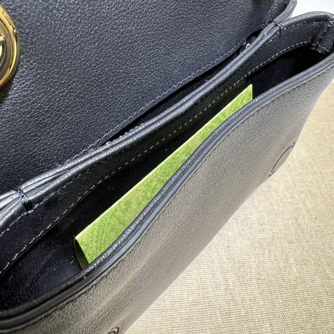Coming from the House’s archives, a geometrically shaped version of the Interlocking G logo is reintroduced for Gucci Love Parade. The gold-toned hardware adds a defined vintage feel to the style, enriching the design with a timeless feel—mirroring the Hollywood glamour that shaped the fashion show. The black leather min bag is completed by two interchangeable shoulder straps, in tonal leather or the Web stripe.