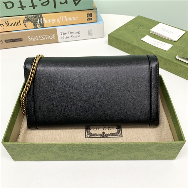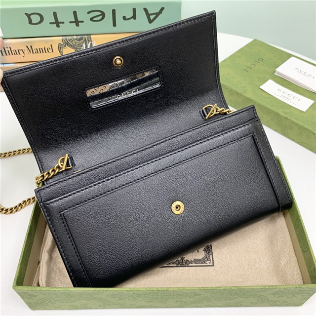 Paying homage to a material at the heart of Gucci’s heritage, this wallet is defined by its bamboo closure. Crafted from smooth black leather, the accessory is completed by Guccio Gucci”s monogram hardware and a delicate chain strap.