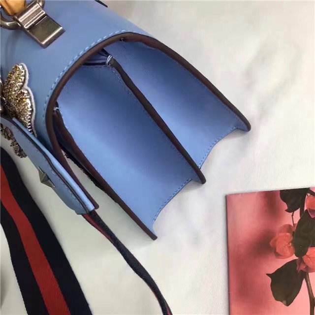 A structured Dionysus bag in smooth leather with textured tiger head spur closure-a unique detail referencing the Greek god Dionysus, who in myth is said to have crossed the river Tigris on a tiger sent to him by Zeus.The bag is further enhanced with two crystal embroidered dragonflies and two sequin embroidered roses appliques.